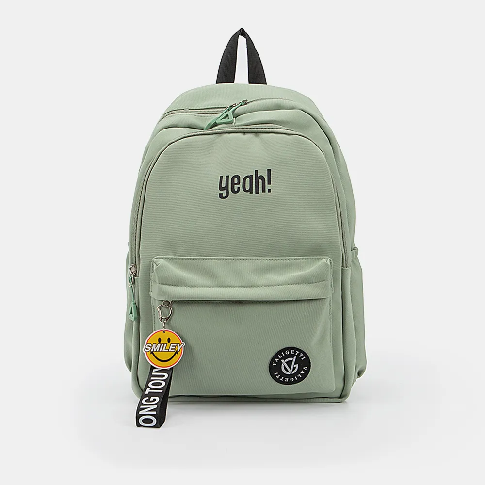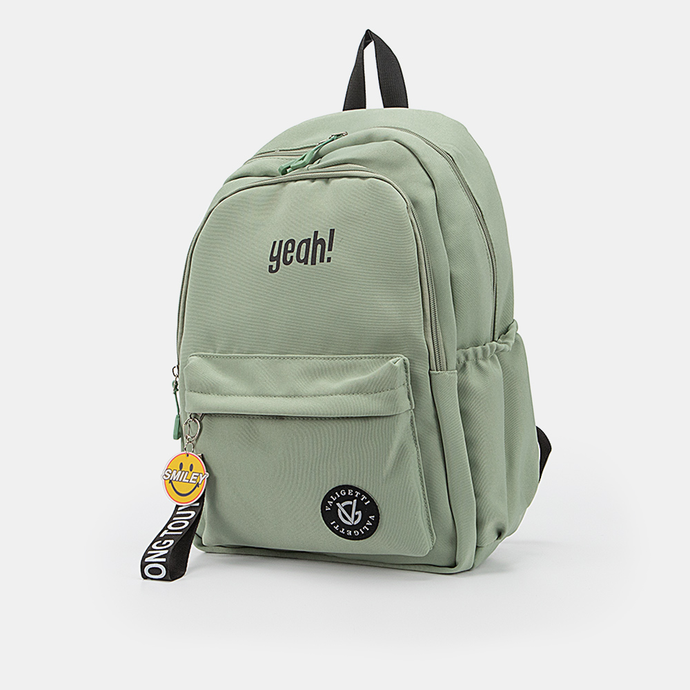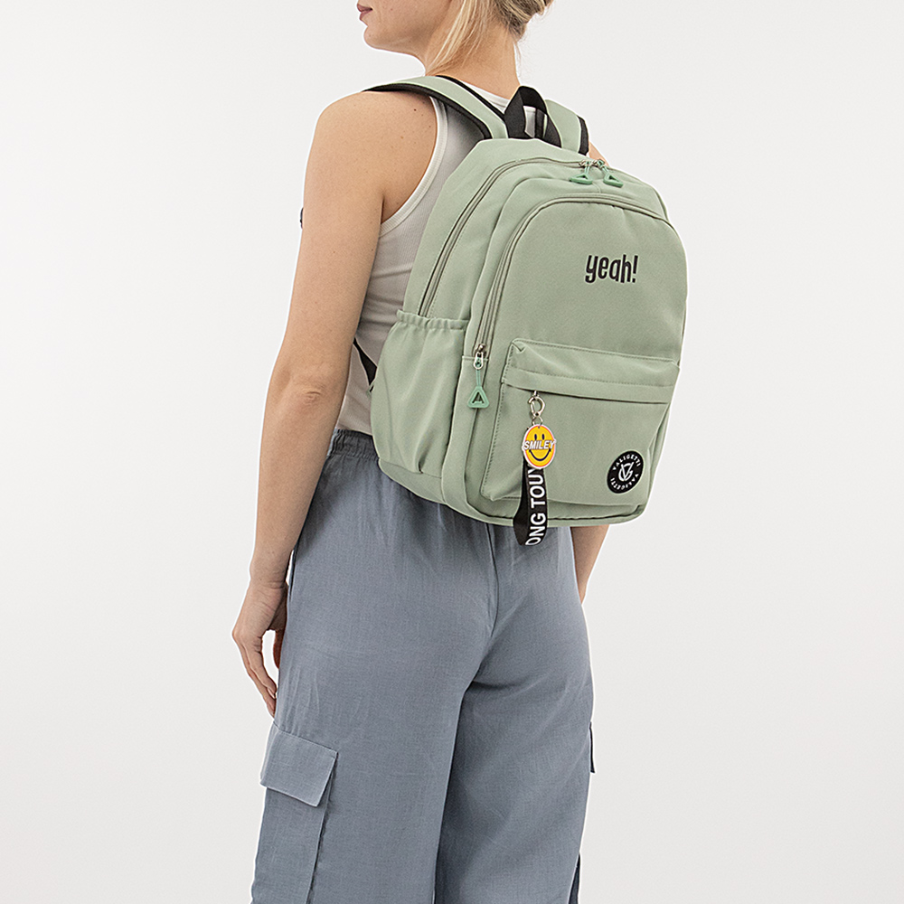 Рюкзак от торговой марки Valigetti из текстильного материала мяьно-зеленого цвета. Модель с лямкой-переноской и широкими плотными регулируемыми плечевыми лямками. Два отделения на молнии. В основном отделении: текстильная подкладка, накладной карман с уплотненной стенкой для ноутбука. На лицевой стороне – накладной карман молнии с оригинальным съемным брелоком-пуллером. По бокам – накладной карман на резинке.