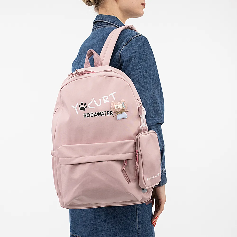 Рюкзак от торговой марки Valigetti из практичного текстильного материала розового цвета. Декорирован надписью и нашивкой-аппликацией в виде кошки. Модель с лямкой-переноской и уплотненными широкими регулируемыми плечевыми лямками. Отделение на молнии. Внутри: текстильная подкладка, накладной карман с уплотненной стенкой для ноутбука. На лицевой стороне – накладной карман на молнии. По бокам – накладной карман на резинке. На спинке имеется карман-антивор на молнии. В комплекте имеется пенал на карабине, с отделением на молнии.