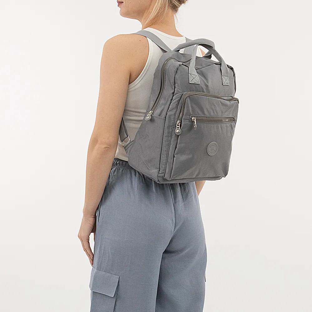Рюкзак от торговой марки Valigetti из практичного текстильного материала серого цвета. Модель с двумя ручками, регулируемыми плечевыми лямками. Отделение на молнии. Внутри: текстильная подкладка, карман на молнии. На лицевой стороне – два кармана на молнии. На спинке – карман на молнии. По бокам – накладной карман.