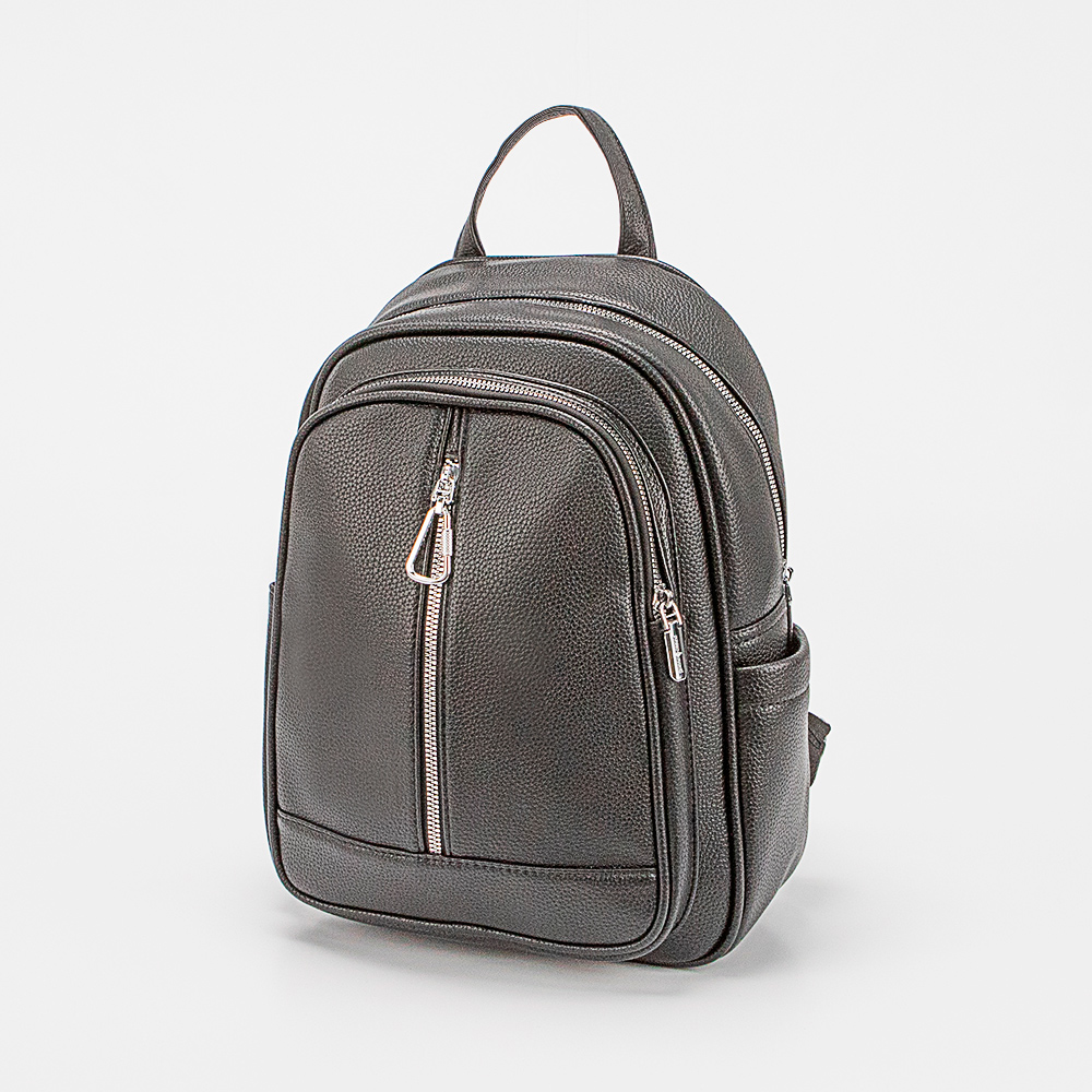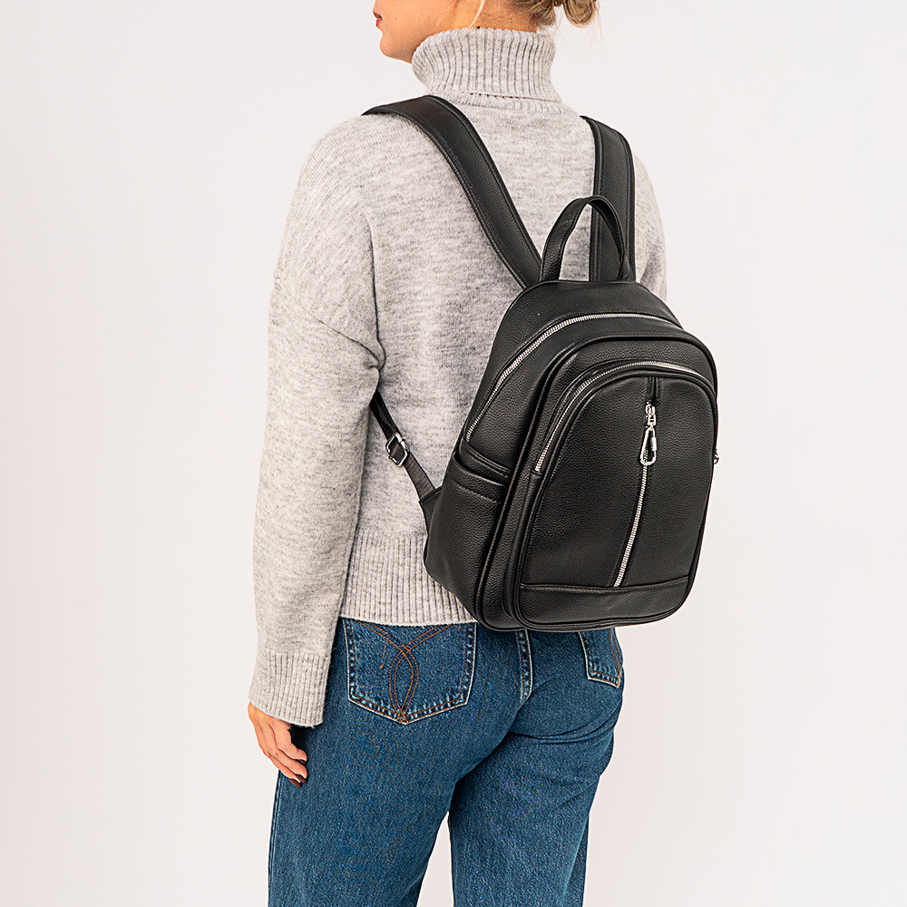 Рюкзак от торговой марки Passo Avanti из искусственной кожи черного цвета. Модель с лямкой-переноской и регулируемыми плечевыми лямками. Отделение на молнии. Внутри: текстильная подкладка, карман на молнии, накладной карман. На лицевой стороне – два кармана на молнии. На задней стороне – карман на молнии. По бокам – накладной карман.