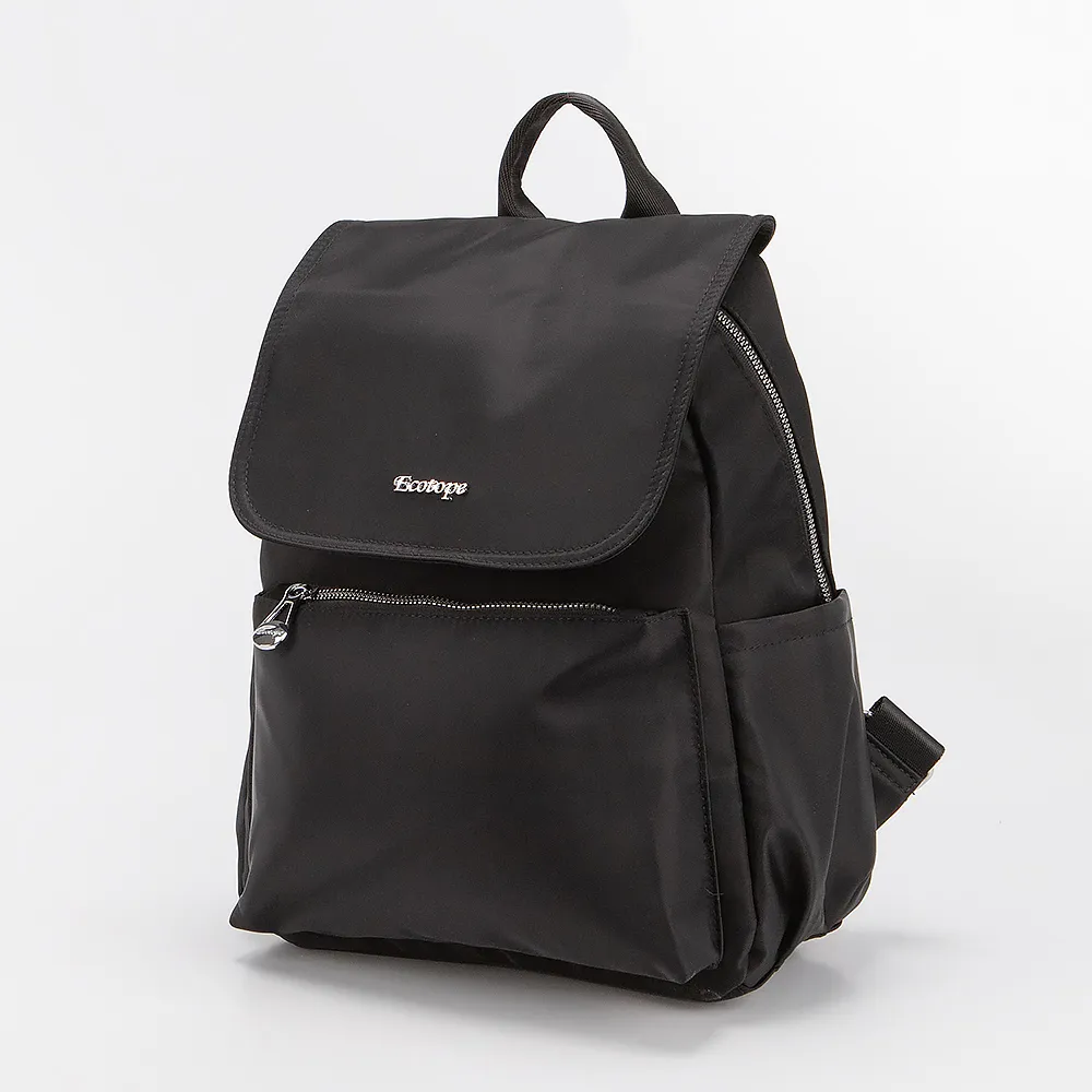 Рюкзак от торговой марки Ecotope выполнен из текстильного материала черного цвета. Модель с лямкой для переноски и регулируемыми плечевыми ремнями. Клапан на магнитной кнопке закрывает отделение на молнии. Внутри: текстильная подкладка, два кармана на молнии. С лицевой и задней стороны - карман на молнии. По бокам - накладные карманы без застежки.