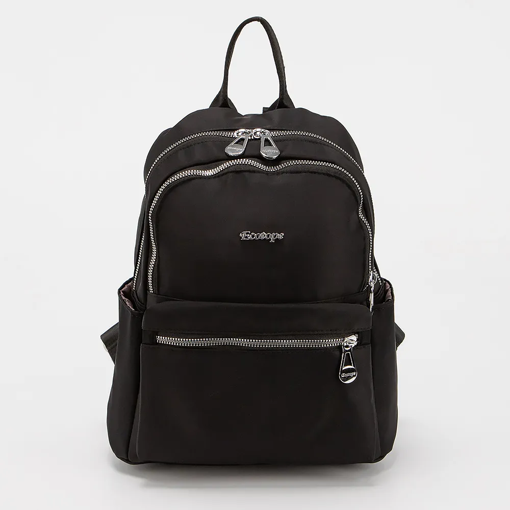 Женский рюкзак от Ecotope выполнен из текстильного материала черного цвета. Снаружи имеет боковые кармашки, два накладных кармана на молнии спереди. Основное отделение на молнии, есть петелька для переноса, плечевые лямки с регулировкой длины, на «спинке» дополнительный карман на молнии.