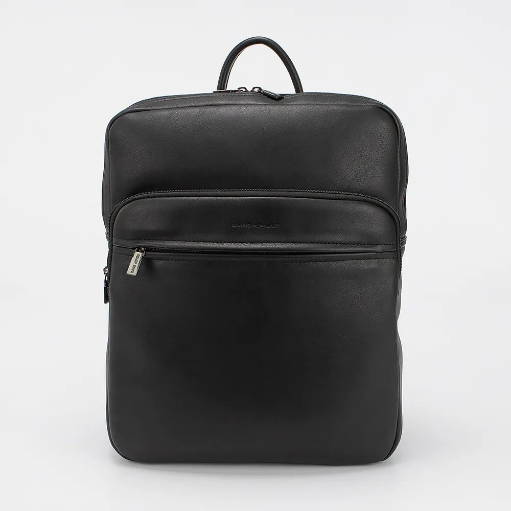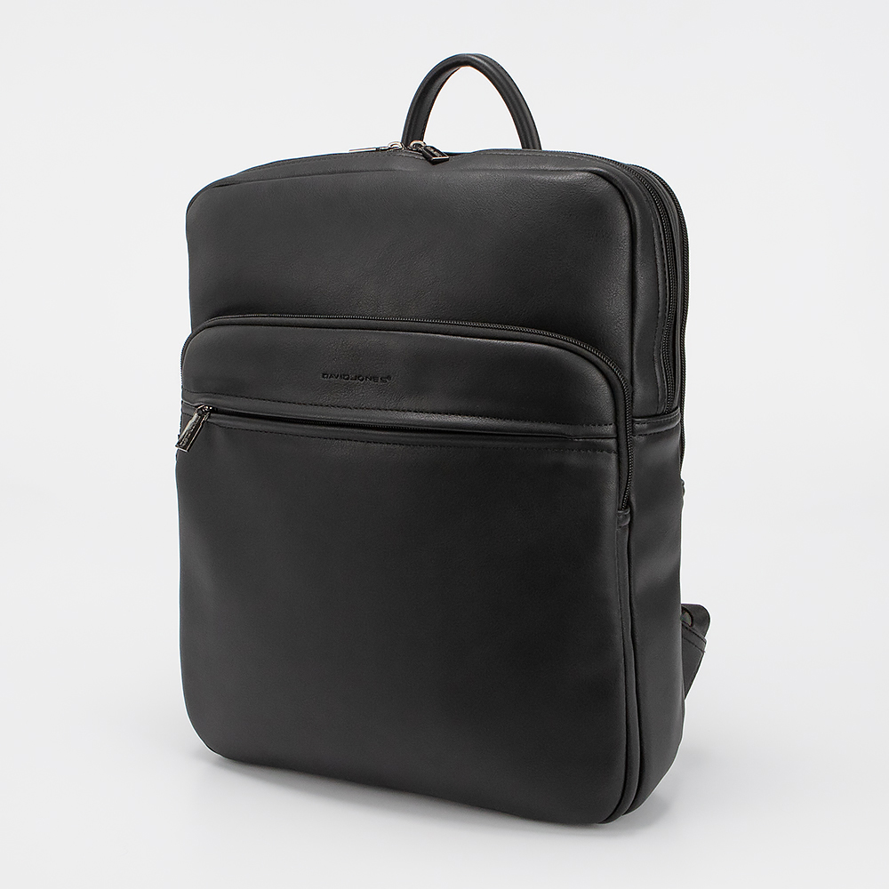 Рюкзак от торговой марки David Jones из искусственной кожи черного цвета. Модель с плотной лямкой и регулируемыми плечевыми лямками, выполненными в комбинации кожи и текстильного материала. Два отделения на молнии с фирменной подкладкой. В основном - карман на молнии, накладной карман. На лицевой стороне два кармана на молнии. На спинке имеется лямка для крепления на выдвижную ручку чемодана.