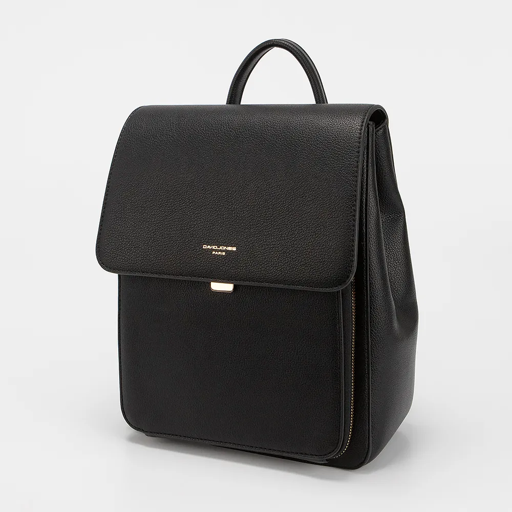 Рюкзак от торговой марки David Jones выполнен из искусственной кожи черного цвета. Компактная модель с плотной лямкой-переноской и регулируемыми плечевыми лямками. Клапан закрывает отделение на молнии и накладной карман на молнии. Внутри текстильная подкладка, уплотненный средник, карман на молнии. На задней стороне - карман на молнии. Дно оснащено металлическими ножками для защиты от износа.