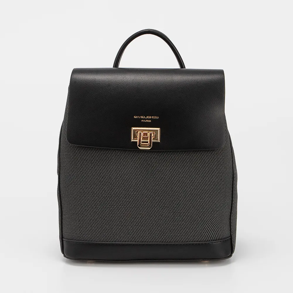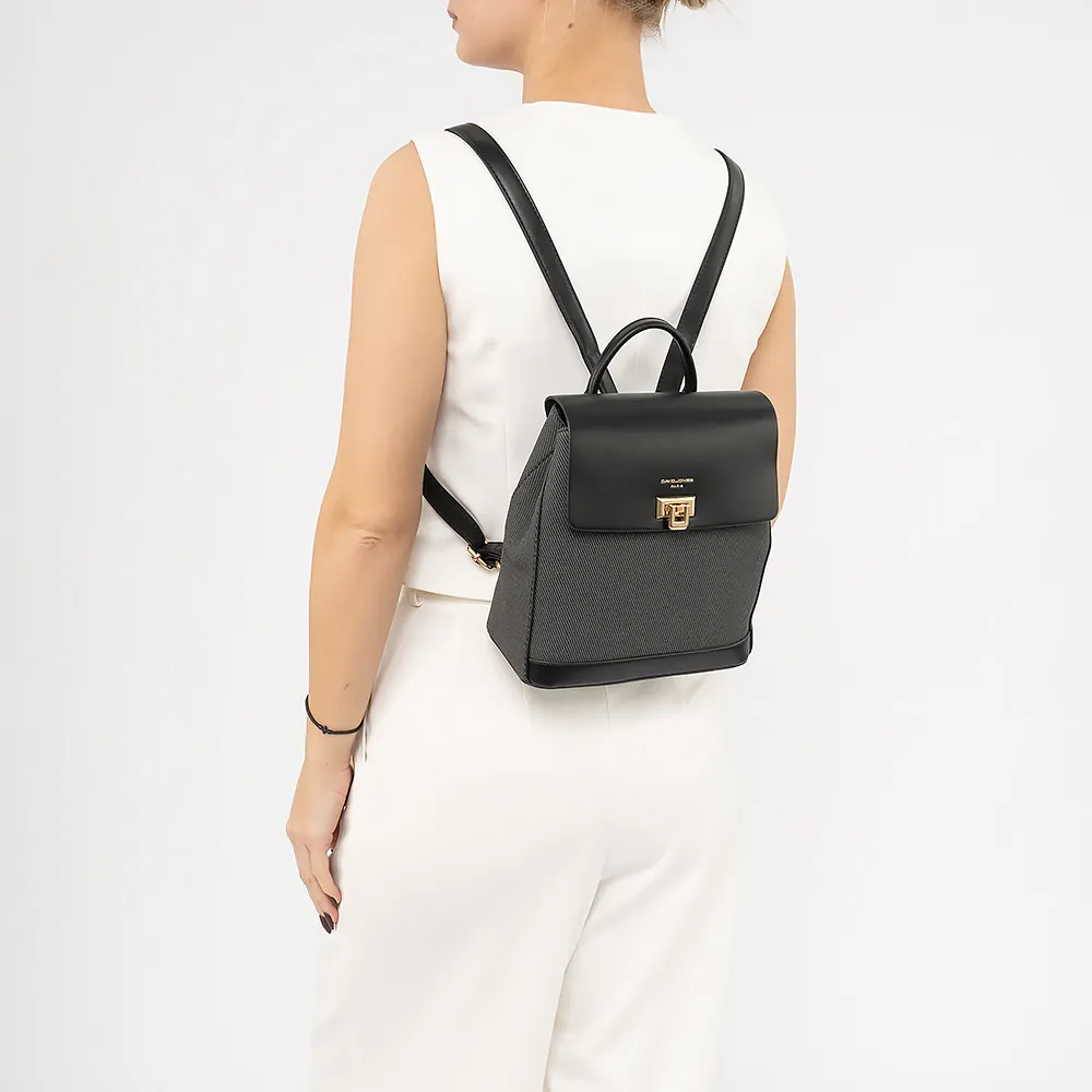 Рюкзак от торговой марки David Jones из искусственной кожи черного цвета. Компактная модель с плотной лямкой-переноской и регулируемыми плечевыми лямками. Клапан закрывает два отделения. Внутри: текстильная подкладка, средник, карман на молнии, накладной карман.
