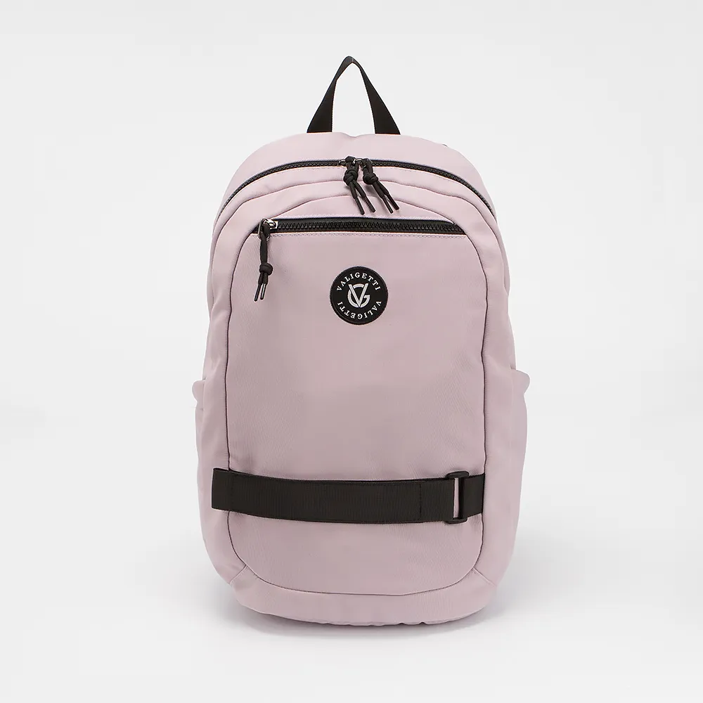 Рюкзак от торговой марки Valigetti из текстильного материала сиреневого цвета. Модель с лямкой и регулируемыми плечевыми ремнями, дополнительно фиксирующимися на груди ремнями с застежкой фастекс. Отделение на молнии. На лицевой стороне - карман на молнии. По бокам карманы без застежек. На задней стороне - лямка для крепления на ручку чемодана.