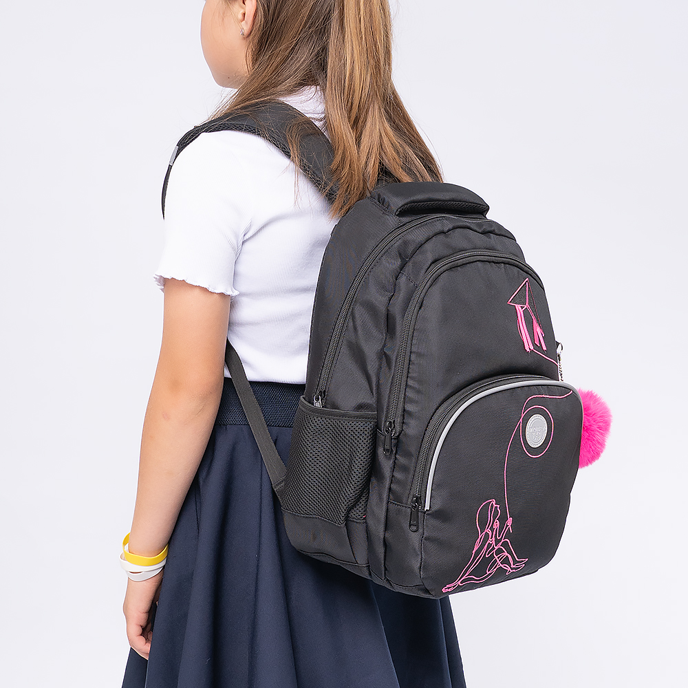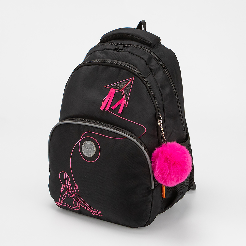 Рюкзак от торговой марки Miqini из текстильного материала черного цвета с розовым принтом. Декорирован подвеской. Модель с лямкой, плотной ручкой для переноски и регулируемыми плечевыми ремнями, дополнительно фиксирующимися на груди ремнями с застежкой фастекс. Два отделения на молнии. Сбоку - накладной карман без застежки.