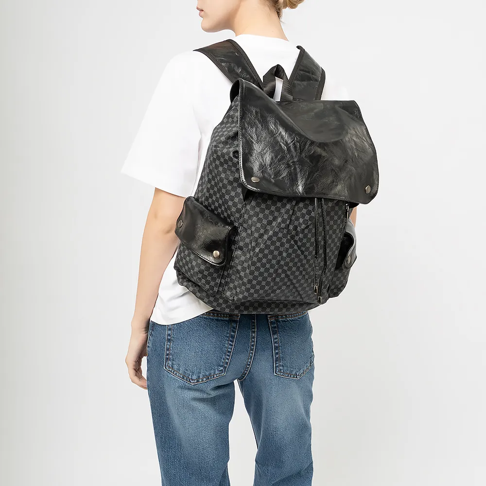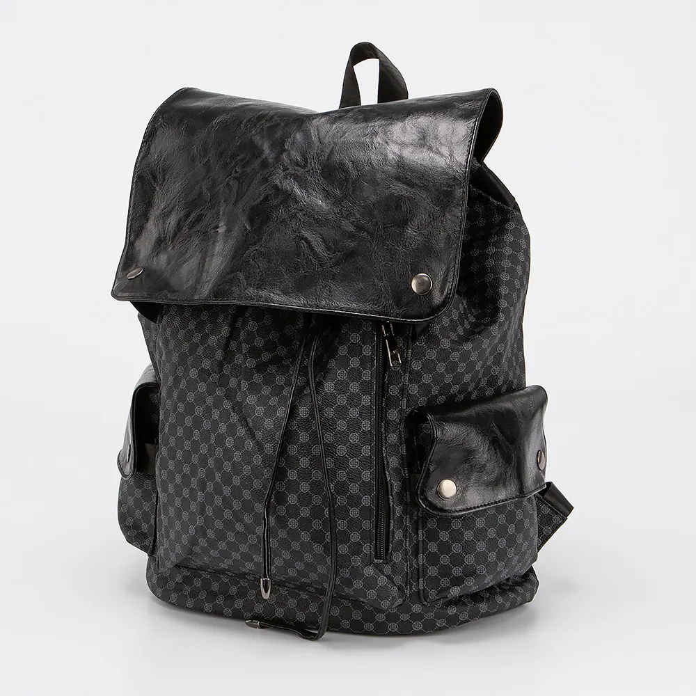 Рюкзак от торговой марки Ecotope из текстильного материала черного цвета с принтом в виде орнамента, с элементами из искусственной кожи. Модель с лямкой-переноской, регулируемыми плечевыми ремнями. Клапан на кнопках закрывает отделение, стягивающееся шнурками по принципу торбы. Внутри: текстильная подкладка, накладной карман. На лицевой стороне - вертикальный карман на молнии. По бокам - накладной карман с клапаном.