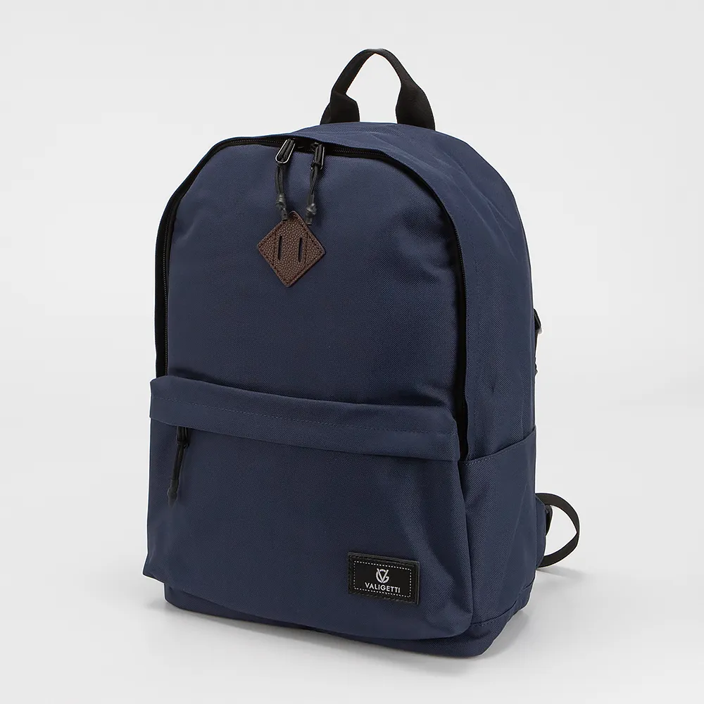Рюкзак от торговой марки Valigetti из текстильного материала синего цвета. Модель с лямкой для переноски и регулируемыми плечевыми ремнями. Отделение на молнии. Внутри: текстильная подкладка, карман для ноутбука, карман на молнии. На лицевой стороне - карман на молнии. По бокам карманы без застежек. На задней стороне - вертикальный карман на молнии.