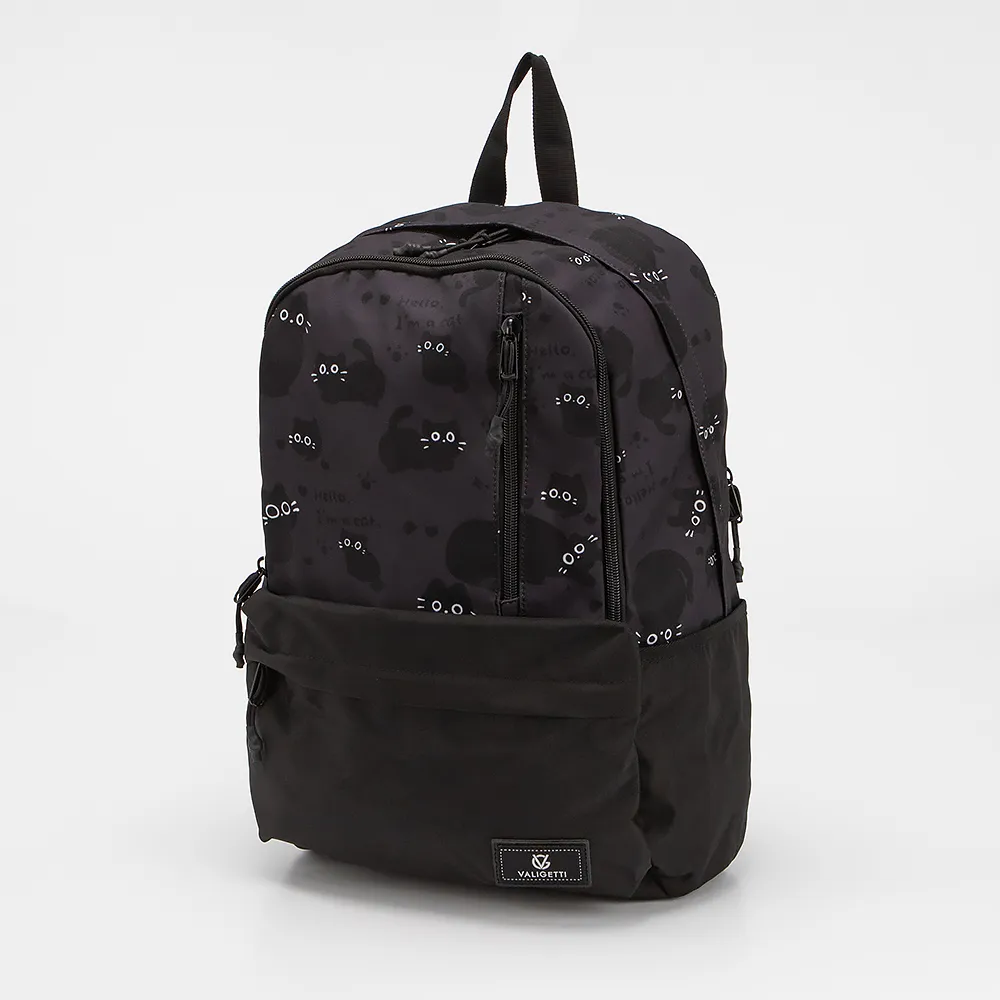 Рюкзак от торговой марки Valigetti из текстильного материала черного цвета с изображением кошачьих глаз. Модель с лямкой для переноски и регулируемыми плечевыми ремнями. Два отделения на молнии. Внутри: текстильная подкладка, карман для ноутбука, карман на молнии. На лицевой стороне - два кармана на молнии. По бокам карманы без застежек. На задней стороне - вертикальный карман на молнии.