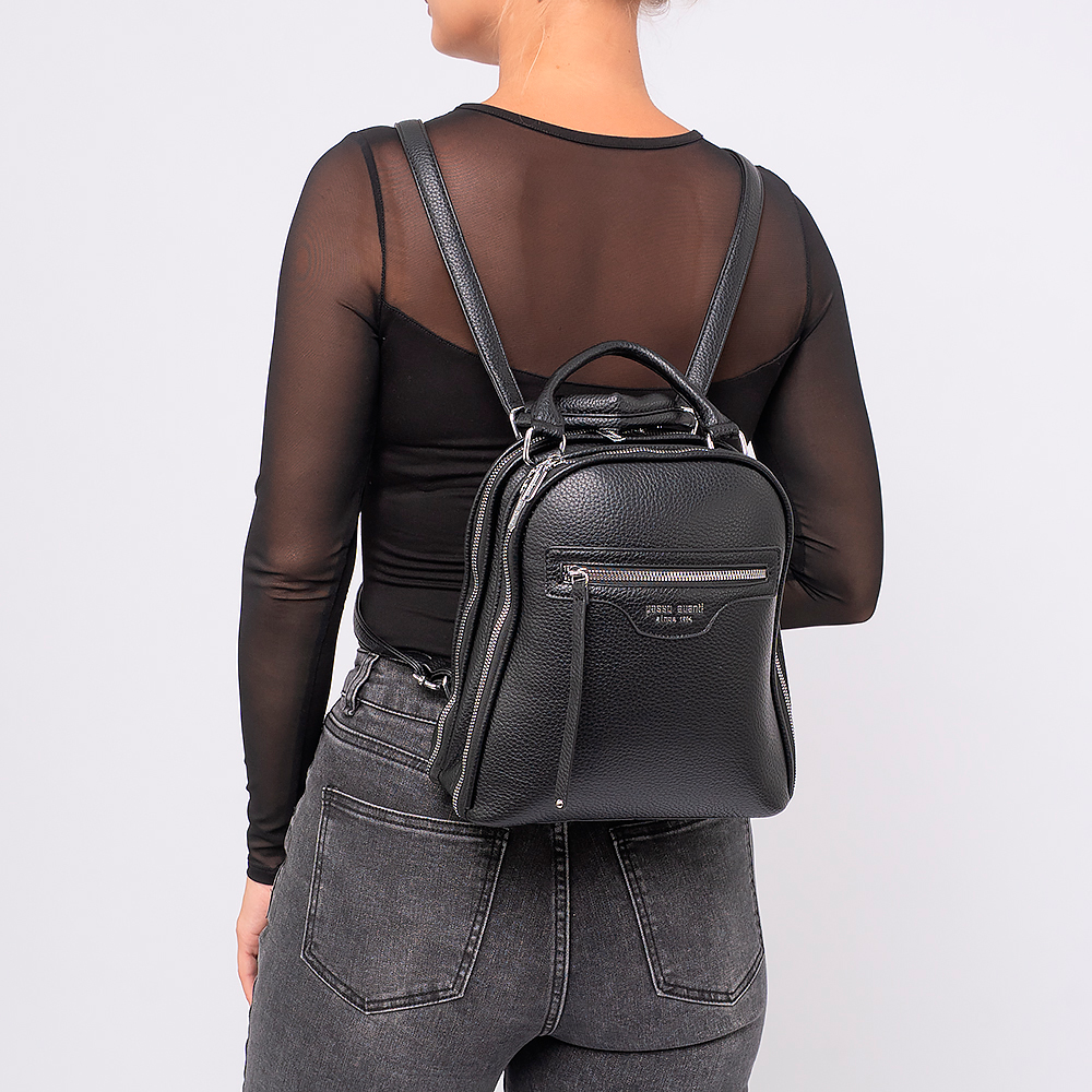 Сумка-рюкзак от торговой марки Passo Avanti выполнен из искусственной кожи черного цвета. Модель с ручкой для переноски и длинным регулируемым ремнем, который стягивается в плечевые лямки. Два отделения на молнии. Внутри: текстильная подкладка, карман на молнии, накладной карман. На лицевой и задней стороне - карман на молнии.