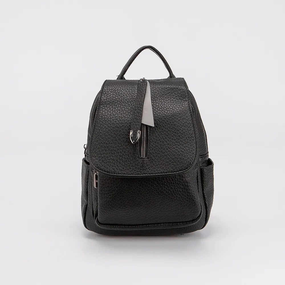 Рюкзак от торговой марки Valigetti выполнен из искусственной кожи черного цвета. Модель с ручкой для переноски и регулируемыми плечевыми ремнями. Клапан на магнитной кнопке закрывает отделение на молнии и карман на молнии. Внутри: текстильная подкладка. По бокам - карманы без застежки. На задней стороне - карман на молнии.