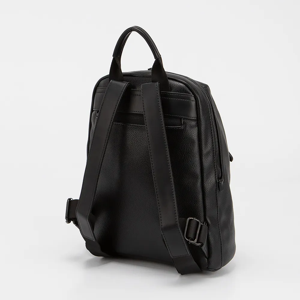 Рюкзак от торговой марки David Jones выполнен из искусственной кожи черного цвета. Модель с ручкой и регулируемыми плечевыми ремнями. Отделение на молнии. Внутри: текстильная подкладка, карман на молнии, накладной карман. На лицевой и задней стороне - карман на молнии.