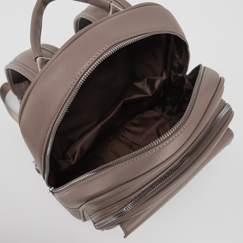 Рюкзак от торговой марки Valigetti выполнен из искусственной кожи кофейного цвета. Модель с ручкой и двумя регулируемыми плечевыми ремнями. Отделение на молнии. Внутри: текстильная подкладка. На лицевой стороне - карман на молнии и карман с клапаном. На задней стороне - карман на молнии.