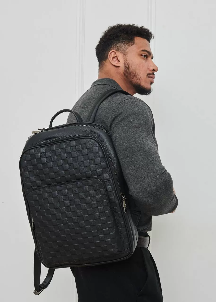 Рюкзак от бренда Valigetti выполнен из натуральной кожи черного цвета. Его лицевая сторона украшена тиснением с шахматным рисунком.