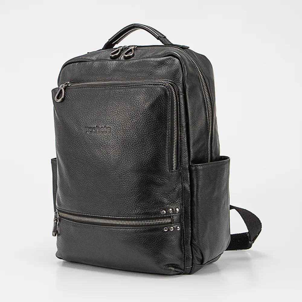Рюкзак от торговой марки Poshete из натуральной кожи и практичного текстильного материала черного цвета. Модель с одной ручкой и регулируемыми плечевыми лямками. Отделение на молнии. Внутри: фирменная подкладка, накладной карман с уплотненной стенкой для ноутбука, накладной карман. На лицевой стороне – два кармана на молнии. По бокам – накладной карман без застежки.