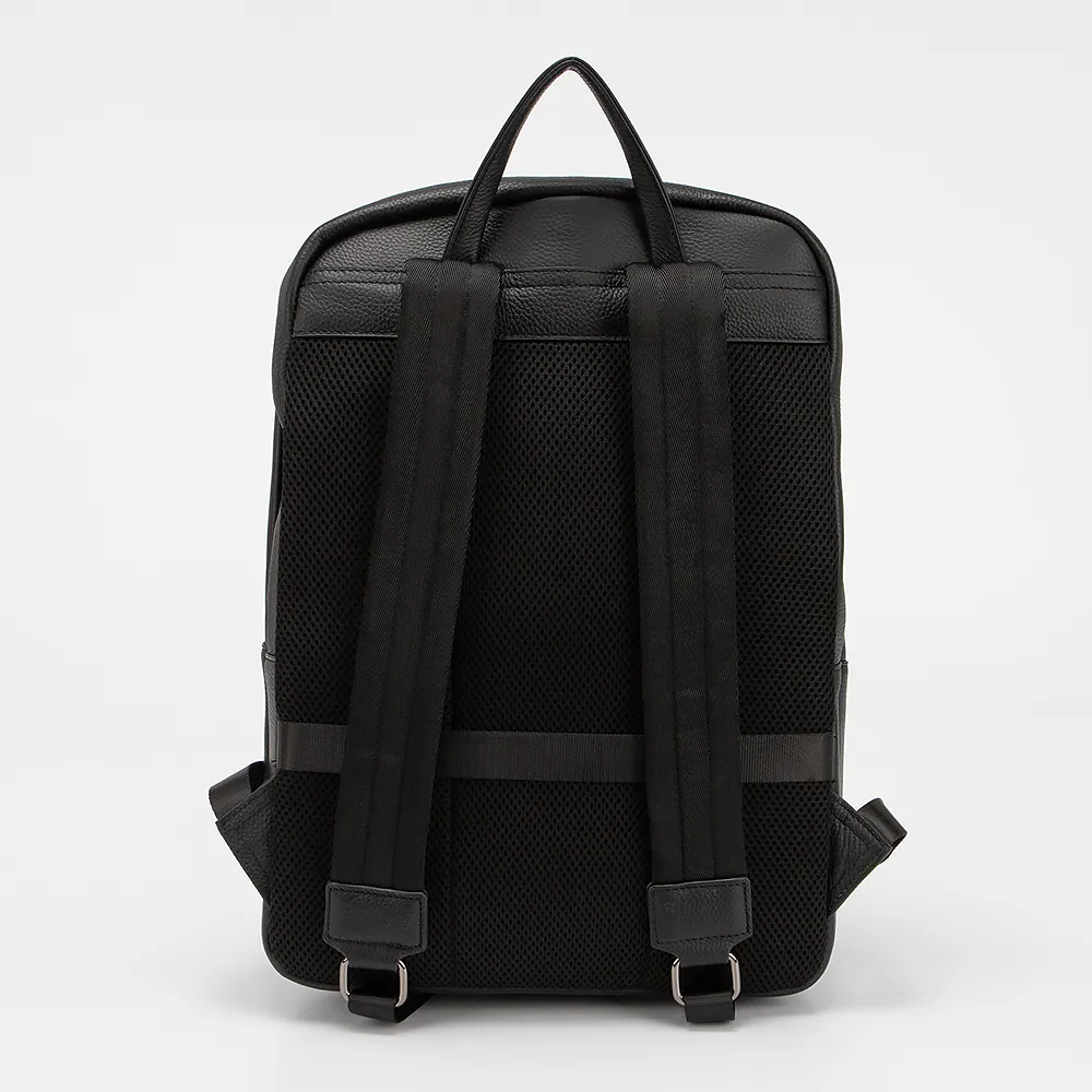 Рюкзак от торговой марки Valigetti из натуральной кожи черного цвета. Лицевая сторона декорирована тиснением с шахматным рисунком. Модель с лямкой-переноской и регулируемыми плечевыми лямками. Два отделения на молнии, с текстильной подкладкой. В основном отделении – накладной карман с уплотненной стенкой для ноутбука, карман на молнии. В переднем отделении – органайзер. На лицевой стороне – накладной карман на молнии. На спинке с верхним дышащим слоем имеется лямка для крепления на выдвижную ручку чемодана.