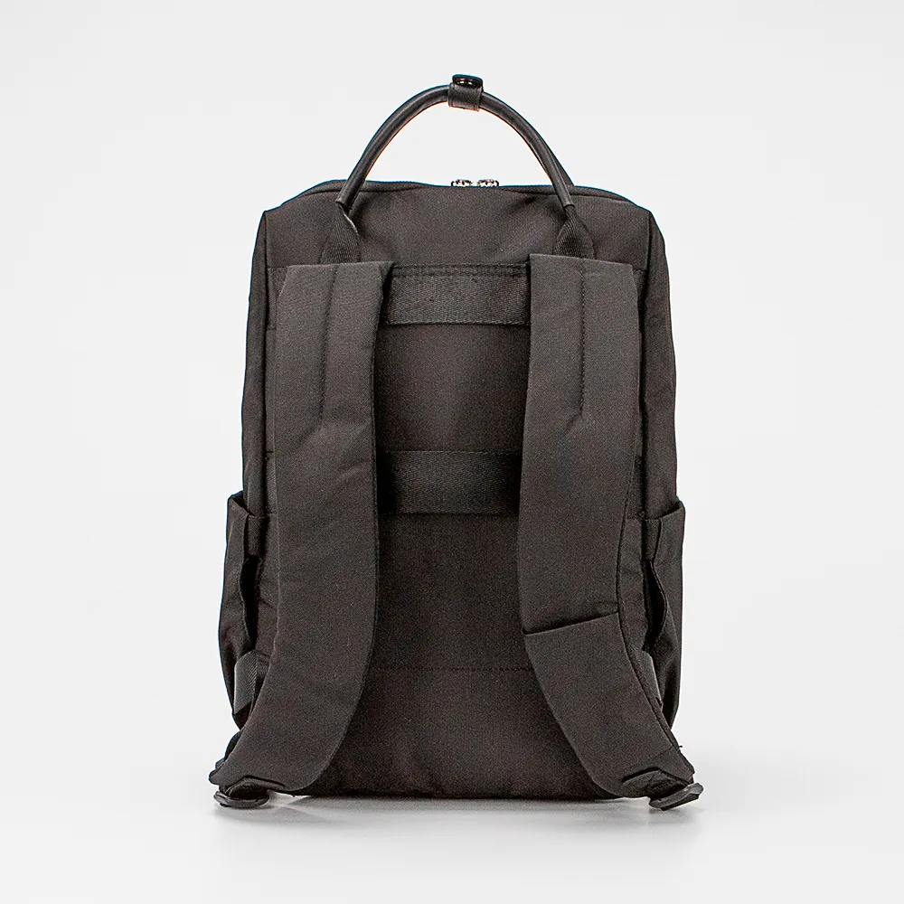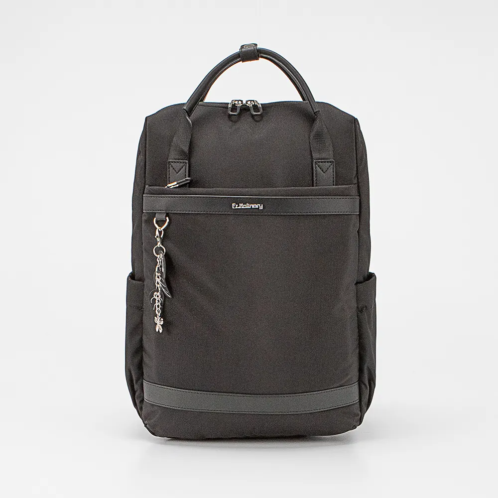 Рюкзак от торговой марки Francesco Molinary из прочного практичного полиэстера с влагоотталкивающей пропиткой и искусственной кожи черного цвета. Модель с двумя ручками с фиксатором на кнопке, мягкими набивными регулируемыми плечевыми лямками с дышащим сетчатым слоем; на одной из лямок – накладной кармашек. Стенки и спинка рюкзака уплотнены. На спинке имеется лямка для фиксации на выдвижную ручку чемодана, карман-антивор на молнии. Отделение на молнии. Внутри: два уплотненных накладных кармана с флисовой подкладкой для гаджетов, органайзер из накладных карманов, в том числе для телефона, крепление для ключей. По бокам – накладной карман без застежки. На лицевой стороне – скрытый карман на молнии и оригинальная съемная декоративная подвеска.
