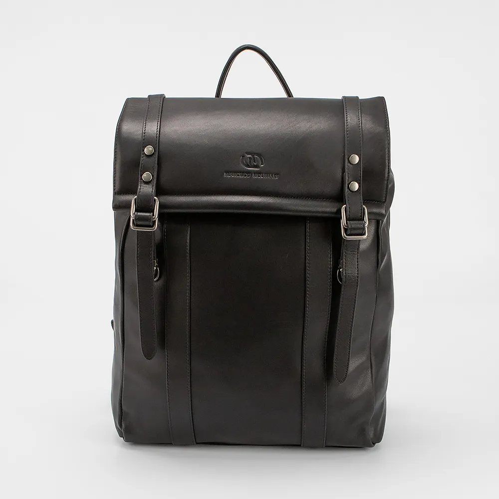 Рюкзак от торговой марки Francesco Molinary из натуральной кожи черного цвета. Модель с лямкой-переноской, регулируемыми плечевыми лямками. Закрывается коротким клапаном на цупферные замки; клапан декорирован ремешками; с внутренней стороны имеется бархатистая подкладка. Глубокое отделение на молнии. Внутри: карман на молнии, накладной карман с уплотненной стенкой для ноутбука, два накладных кармана. Спинка с дышащей сетчатой накладкой; имеется карман на молнии и лямка для крепления на выдвижную ручку чемодана.