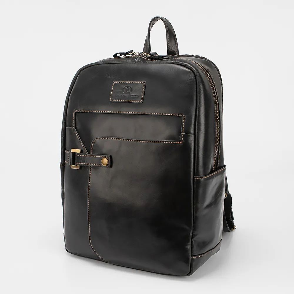Рюкзак от торговой марки Francesco Molinary из натуральной кожи черного цвета с контрастной отстрочкой. Вместительная модель с лямкой-переноской, регулируемыми плечевыми ремнями. Два Отделения на молнии. Внутри: фирменная подкладка, накладной карман с уплотненной стенкой для ноутбука, два накладных кармана, карман на молнии. Лицевая сторона декорирована ремешком на кнопке. По бокам - накладные карманы без застежки. На спинке - вертикальный карман на молнии.