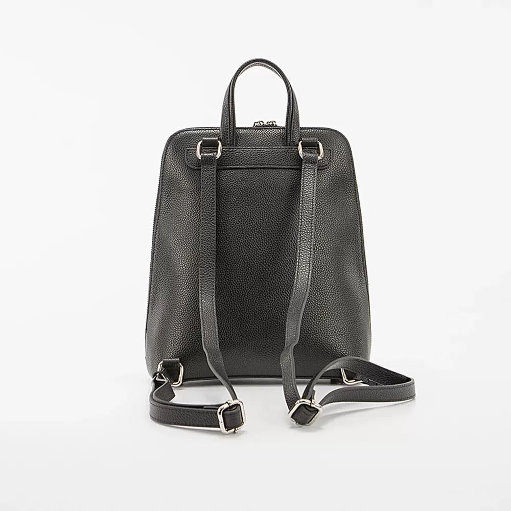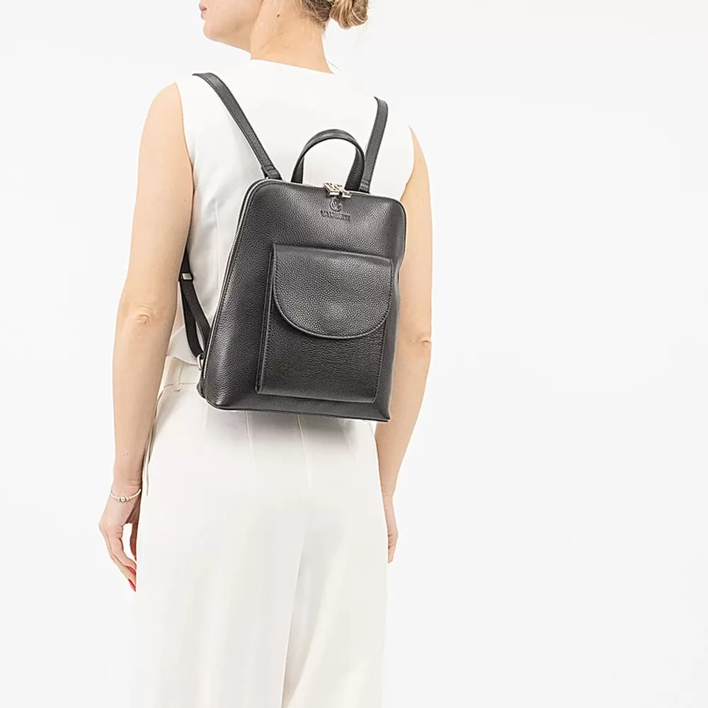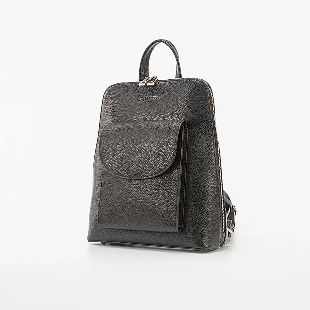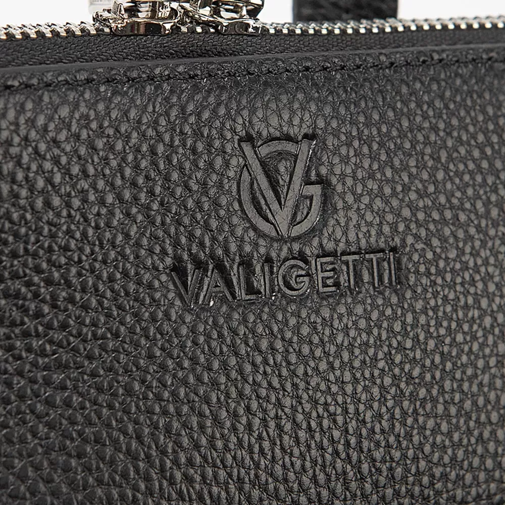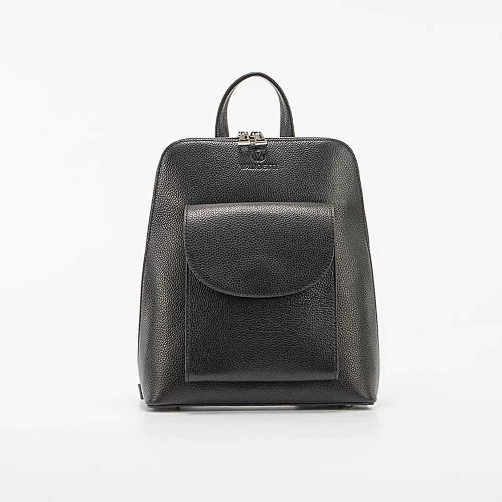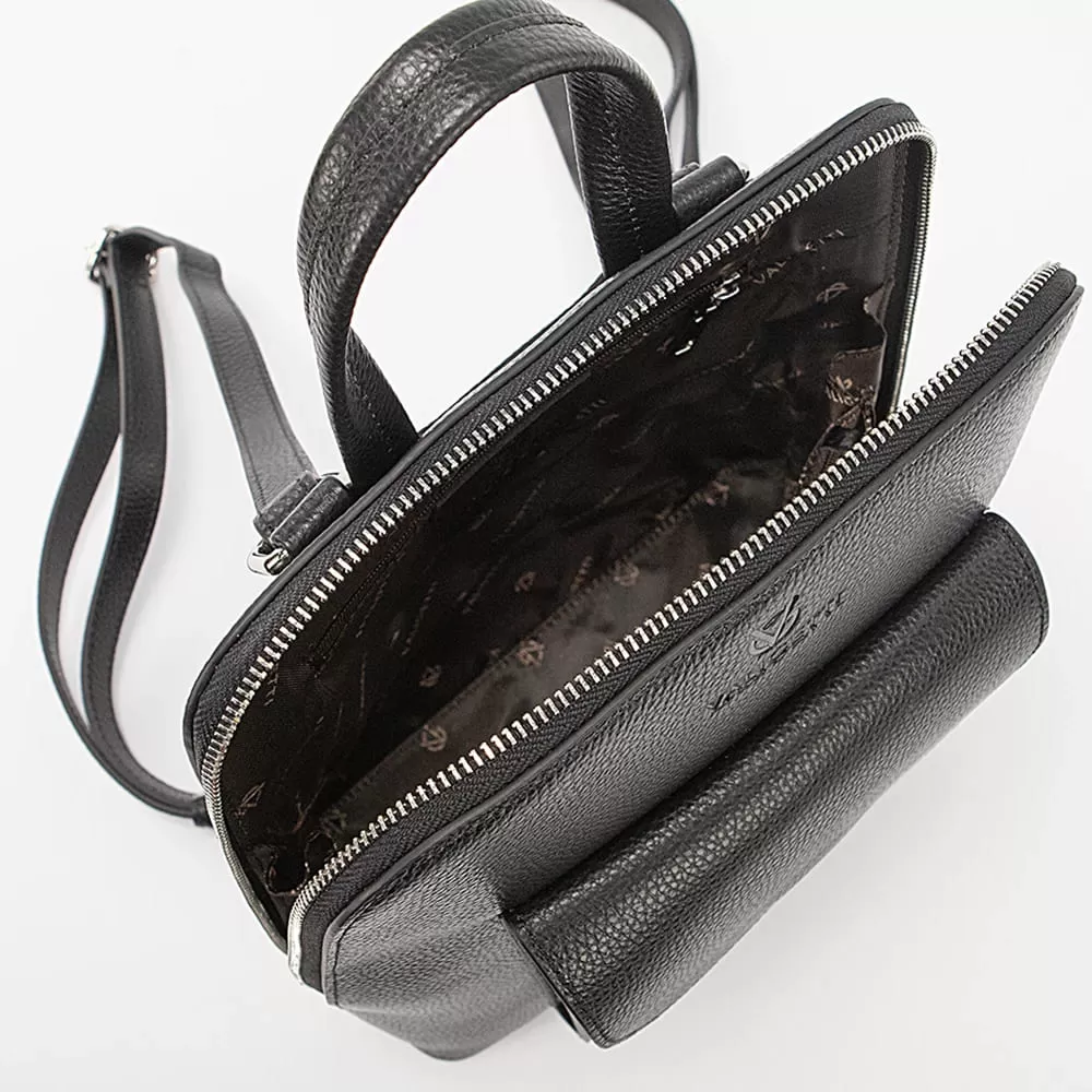 Рюкзак от Valigetti выполнен из натуральной кожи чёрного цвета. Он оснащён удобной лямкой для переноски и регулируемыми плечевыми лямками. Основное отделение закрывается на молнию с двумя встречными бегунками.