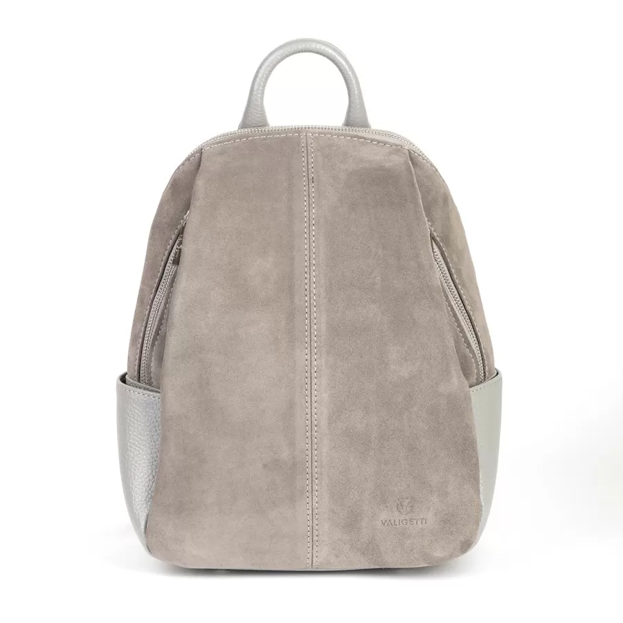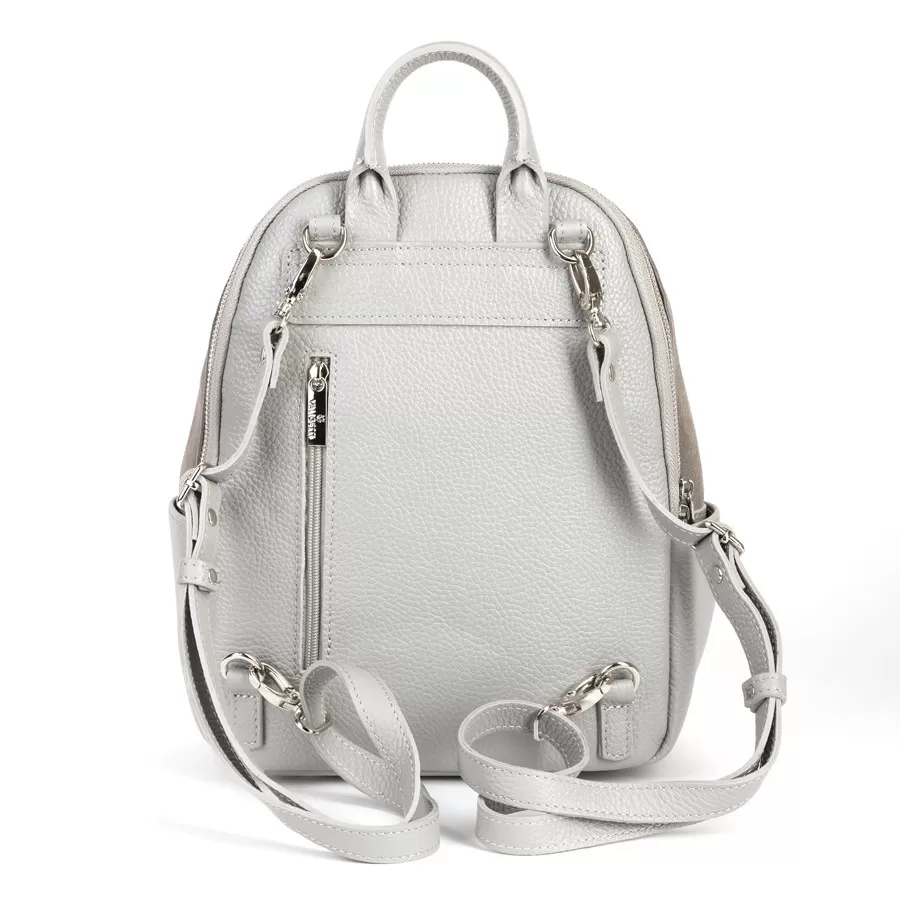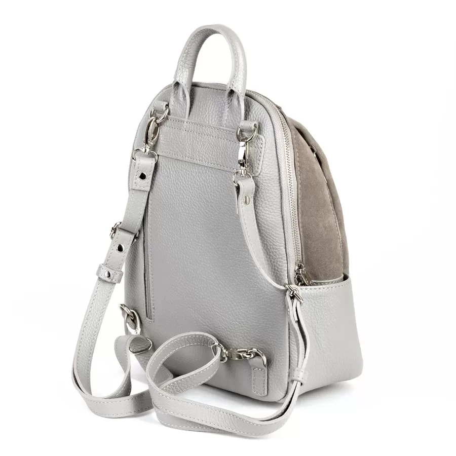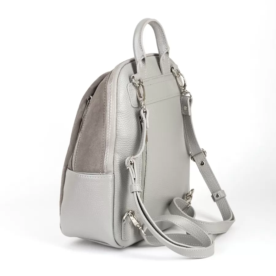 Стильный рюкзак из комбинированных материалов: кожа светло‑серого оттенка и замша цвета taupe на фронтальной панели. Дизайн современный и минималистичный, с акцентом на фактуру и качество материалов. Два боковых кармана и ножки на дне.