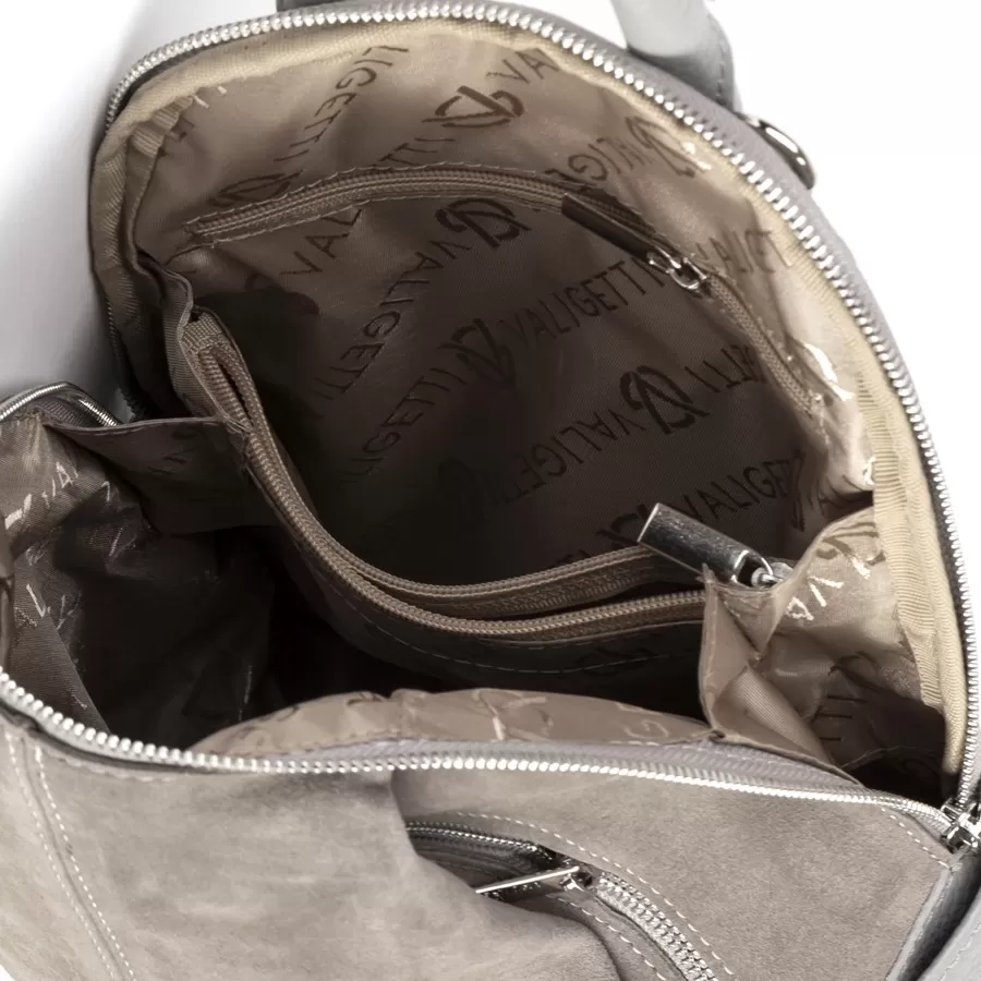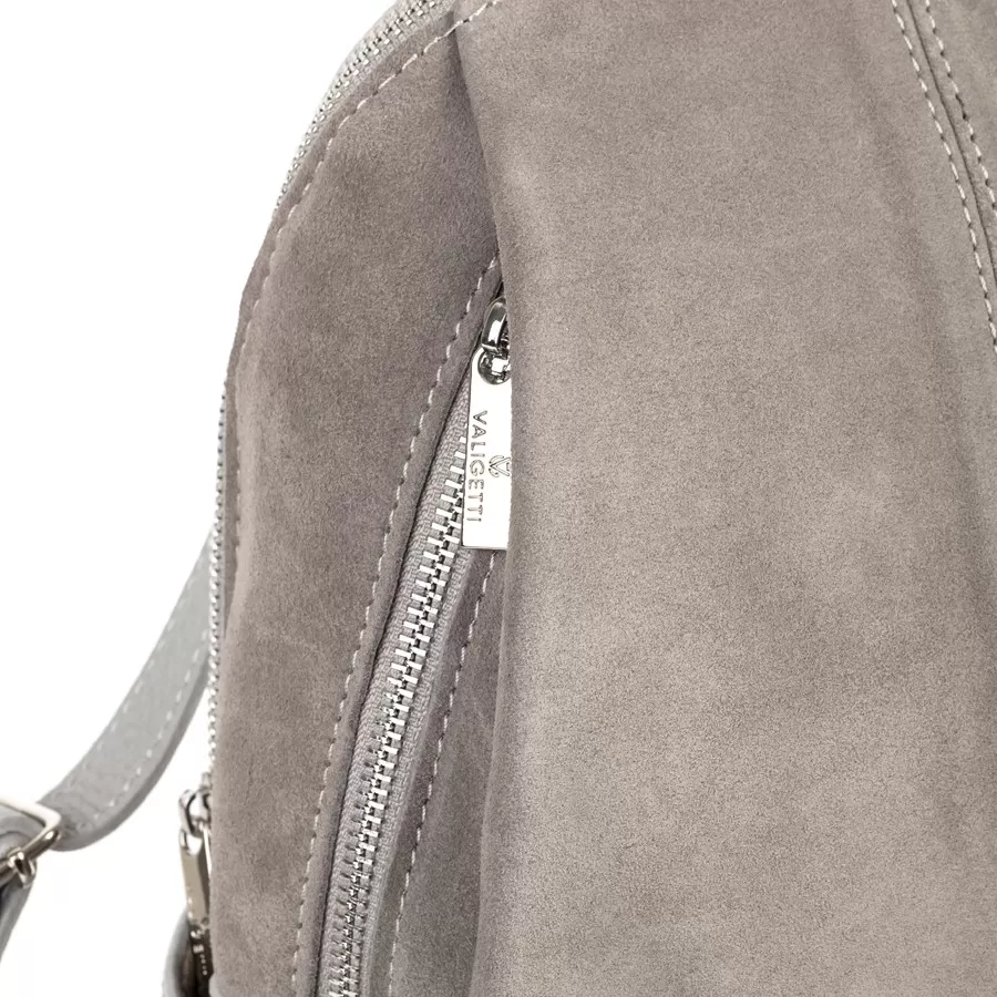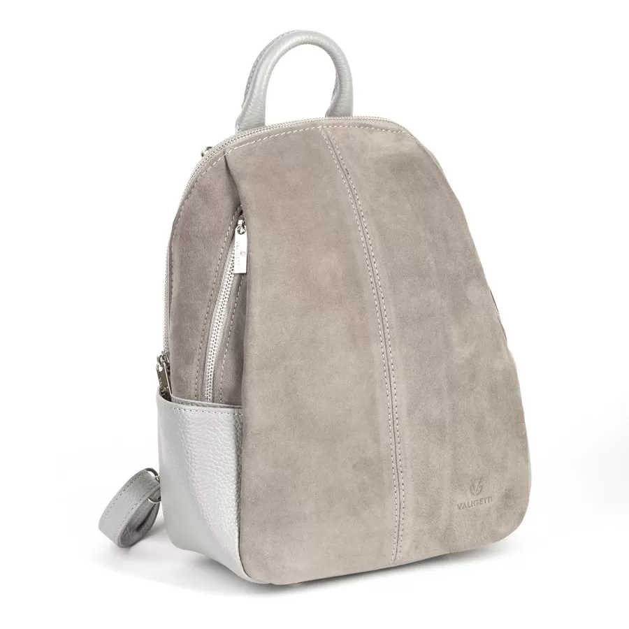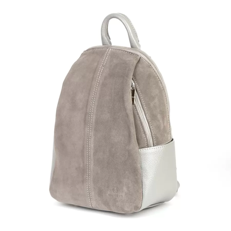 Стильный рюкзак из комбинированных материалов: кожа светло‑серого оттенка и замша цвета taupe на фронтальной панели. Дизайн современный и минималистичный, с акцентом на фактуру и качество материалов. Два боковых кармана и ножки на дне.