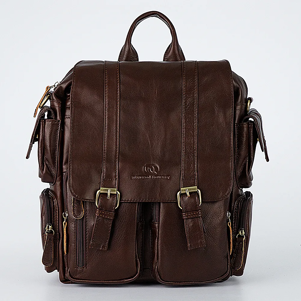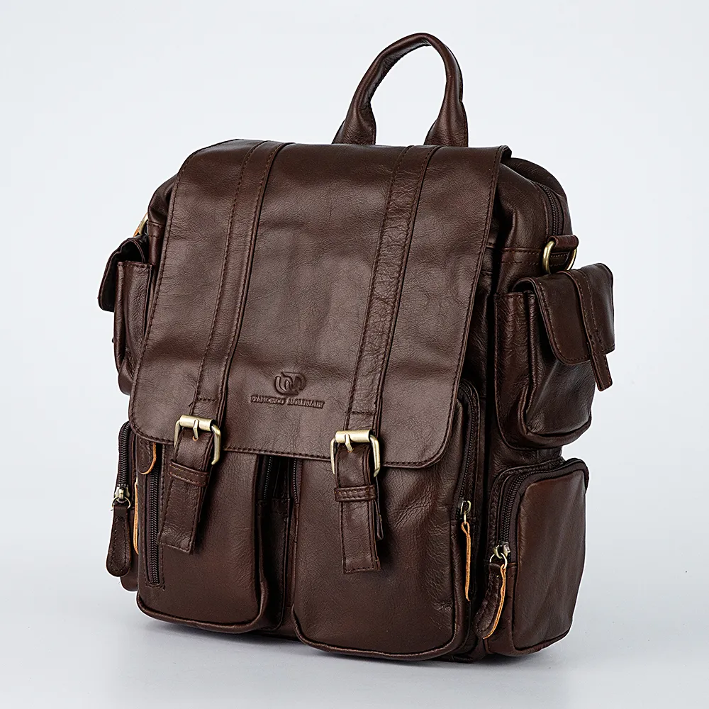 Большое количество карманов, а именно тринадцать, делает этот рюкзак универсальным и молодёжным. Рюкзак от бренда Francesco Molinary выполнен очень качественно, из натуральной кожи, что добавляет ему солидности. Спереди крышка на магнитах с декоративными ремнями, под ней накладные карманы и прорезной на молнии. По два боковых кармана слева и справа и основное отделение на молнии. Фурнитура металлическая золотистого цвета. Лямки рюкзака снизу на карабинчиках, что позволяет отстегнуть их и убрать в задний карман на молнии. После чего воспользоваться плотной кожаной ручкой для ношения в руке.