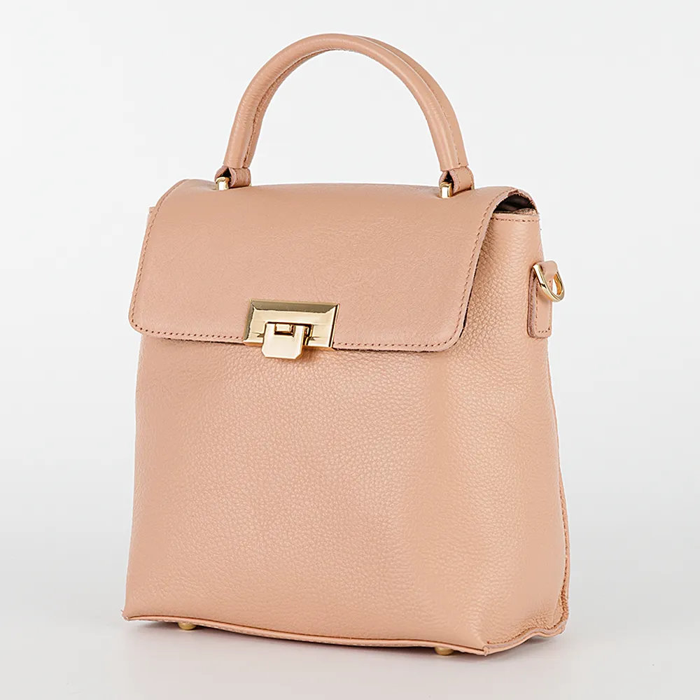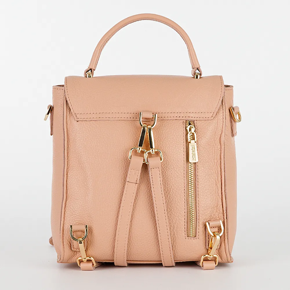 Стильная компактная сумка-рюкзак от бренда Poshete выполнена из натуральной кожи светло-розового цвета. Модель с удобной плотной ручкой, съемными плечевыми лямками, которые крепятся и используются как плечевой ремень. Фурнитура золотистого цвета. Рюкзак закрывается клапаном на поворотном замке. Отделение на молнии. Внутри: текстильная подкладка, карман на молнии, накладной карман. На задней стороне – вертикальный карман на молнии. Дно аксессуара оснащено металлическими ножками от износа.