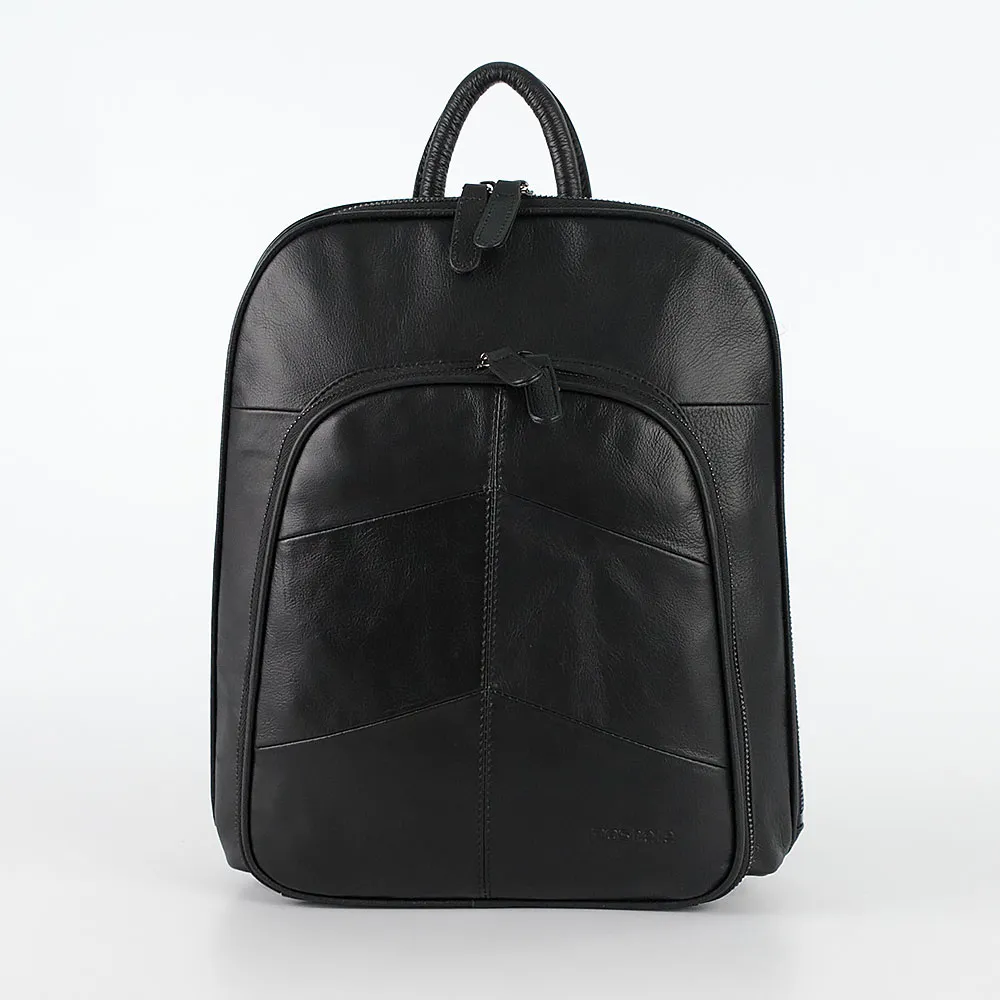 Стильный рюкзак от бренда Poshete выполнен из натуральной кожи насыщенного черного цвета. Модель в форме купола, с плотной ручкой и двумя плечевыми лямками с текстильной изнаночной стороной. Отделение на молнии по трем сторонам, что обеспечивает удобный доступ внутрь. Широко раскрывается гармошкой за счет вытачек. Внутри: средник и карман на молнии, накладной карман. На задней стороне – карман на молнии. На передней – накладной закругленный карман на молнии.