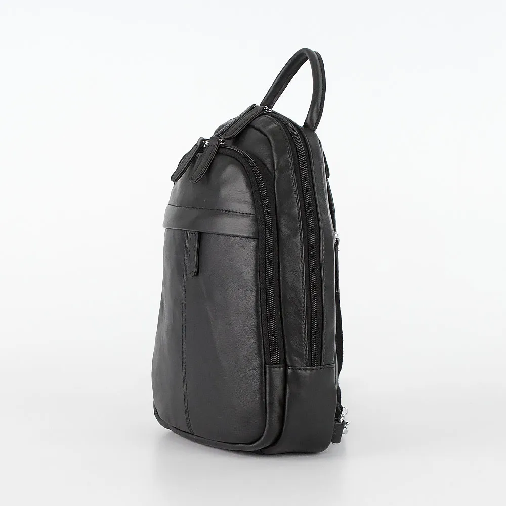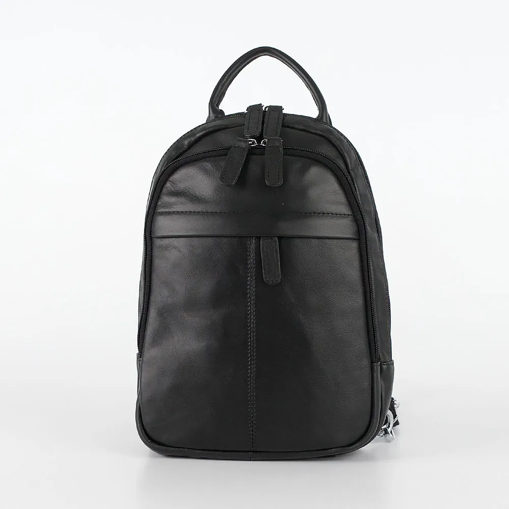 Повседневный женский рюкзачок Poshete чёрного цвета, выполнен из натуральной матовой кожи. Модель имеет два основных отделения на мо лниях, расстёгивающихся по трём сторонам, ручку сверху и заднюю лямку, которую можно отстегнуть снизу и убрать в карман на молнии, также лямка расстёгивается пополам для удобного ношения за спиной, спереди есть карман на скрытой молнии.