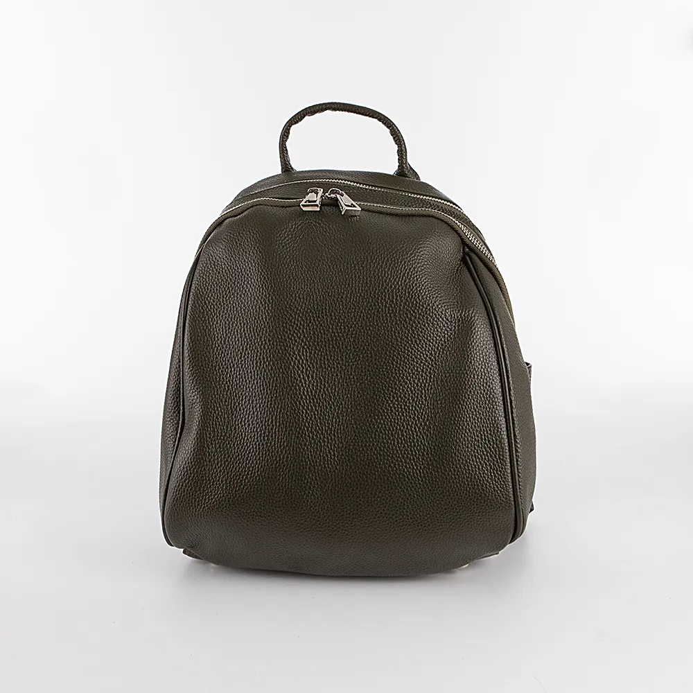 Рюкзак от торговой марки Poshete из натуральной кожи цвета хаки. Модель с лямкой-переноской и регулируемыми плечевыми лямками. Два отделения на молнии, с текстильной подкладкой. Переднее отделение на молнии с двумя встречными бегунками; внутри: два накладных кармана. В основном отделении: карман на молнии, перегородка с карманом на молнии, образующая накладной карман. По бокам – накладной карман на кнопке. На задней стороне – вертикальный карман на молнии. Дно оснащено металлическими ножами для защиты от износа.