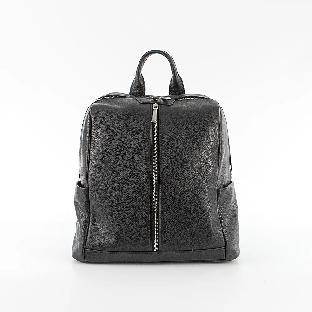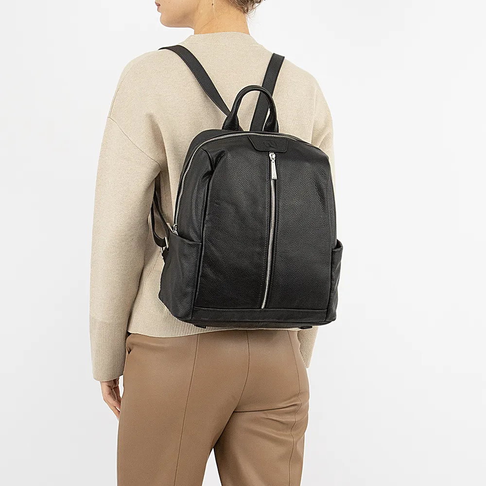 Рюкзак от торговой марки Francesco Molinary из натуральной кожи черного цвета. Модель с лямкой-переноской и регулируемыми плечевыми лямками. Отделение на молнии с двумя бегунками широко раскрывается, обеспечивая удобный доступ. Внутри: фирменная подкладка, два накладных кармана, карман на молнии. На лицевой и задней сторонах – карман на молнии. По бокам – накладной карман без застежки. На дне имеются нашивки для защиты от износа.