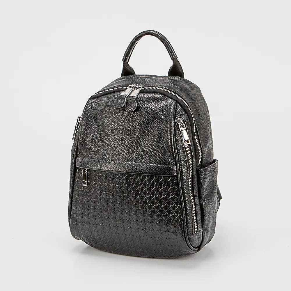 Рюкзак от торговой марки Poshete из натуральной кожи черного цвета. Модель с лямкой-переноской, регулируемыми плечевыми лямками. Отделение на молнии. Внутри: фирменная подкладка, карман на молнии, накладной карман, перегородка. На лицевой стороне, декорированной оригинальным тиснением, имеется три кармана на молнии. На спинке – карман на молнии.