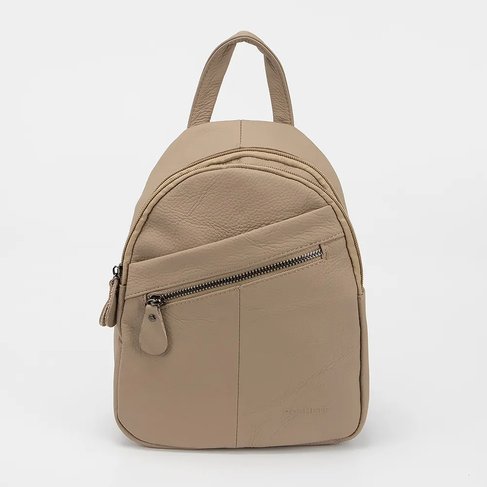 Рюкзак от торговой марки Poshete из натуральной кожи бежевого цвета. Компактная модель с лямкой-переноской и регулируемыми плечевыми лямками с разделяющей молнией и на карабине, благодаря чему рюкзак можно носить как однолямочный на одной широкой лямке как на левом, так и на правом плече. Два отделения на молнии. В основном отделении – текстильная подкладка, карман на молнии, накладной карман. На лицевой и задней сторонах - карман на молнии.
