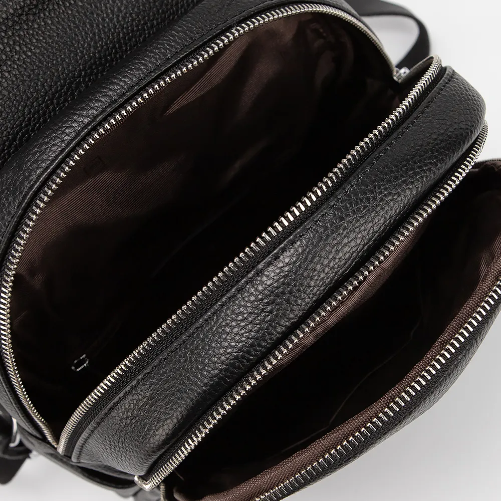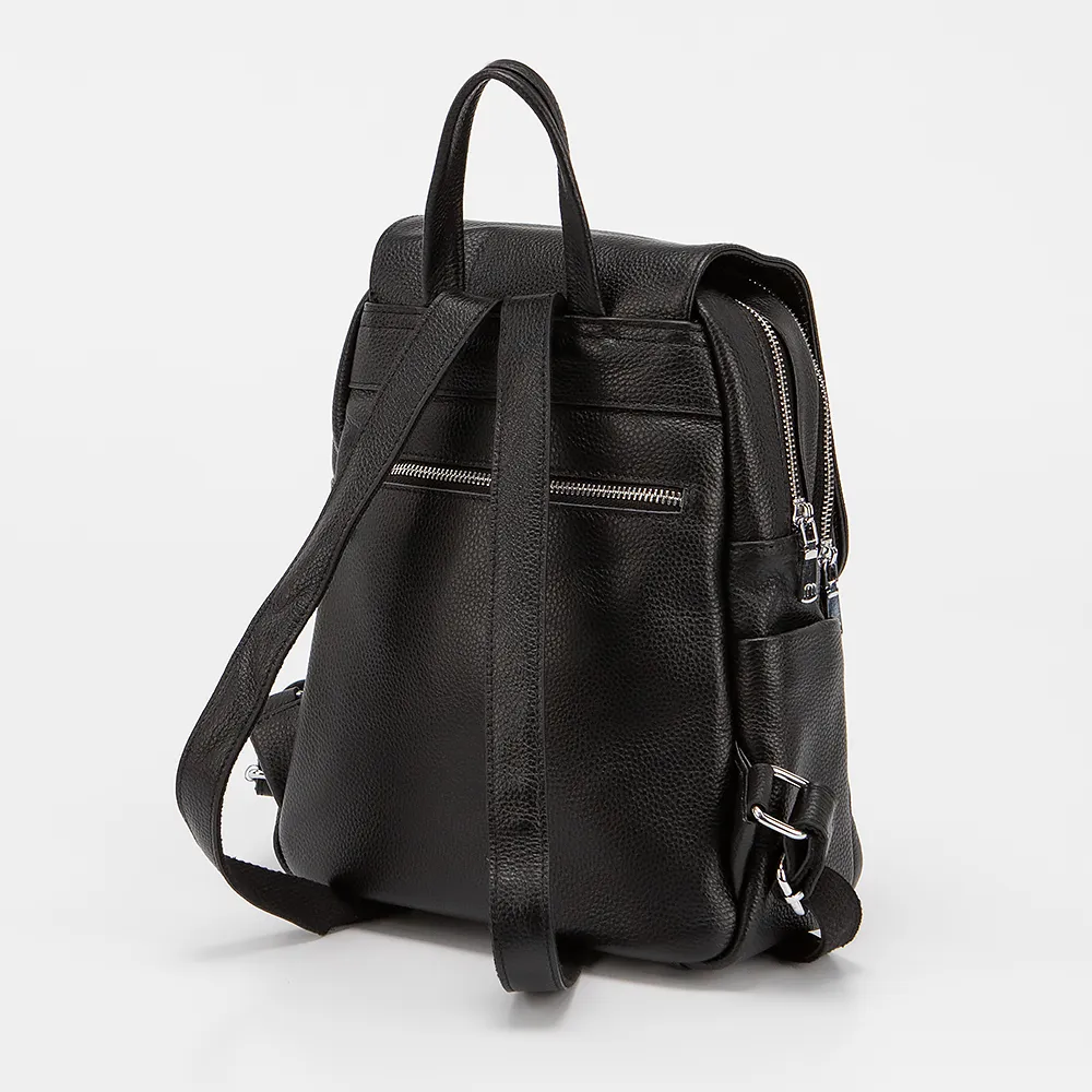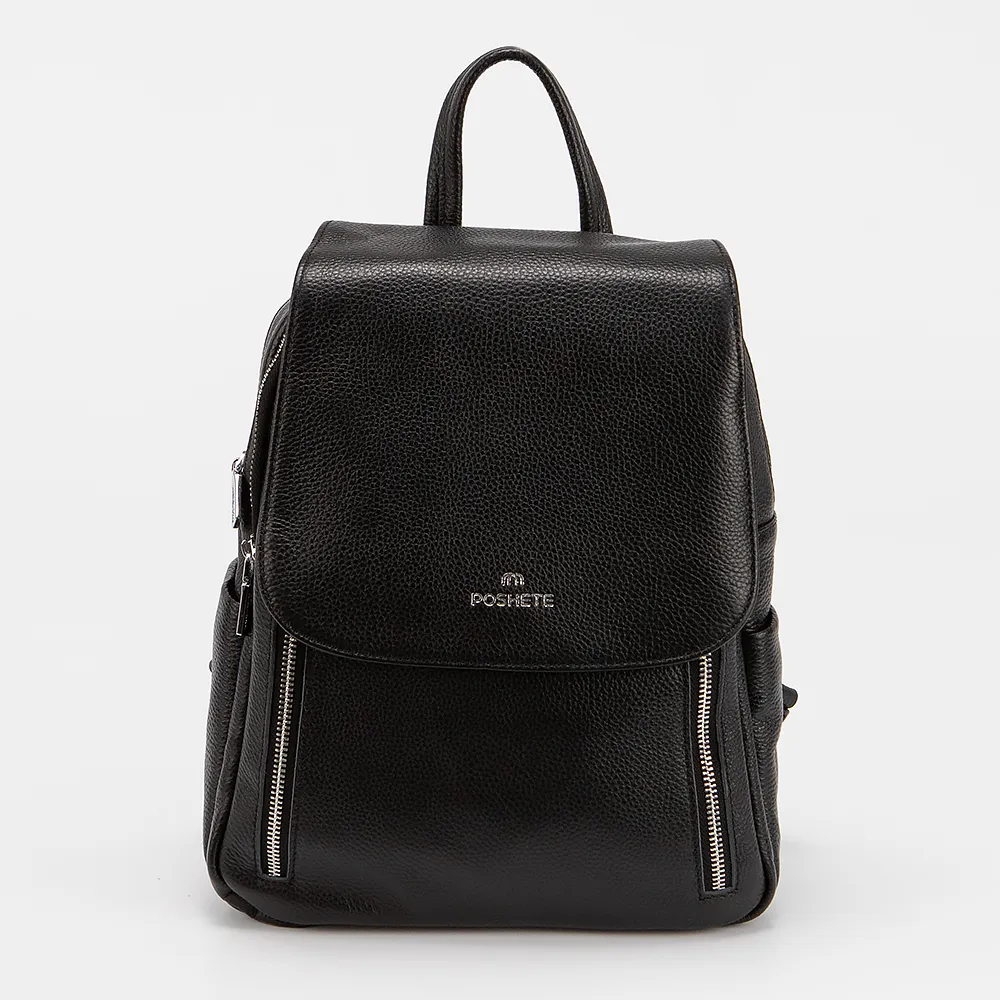 Рюкзак от торговой марки Poshete выполнен из натуральной кожи черного цвета. Модель с лямкой для переноски и регулируемыми плечевыми ремнями. Клапан закрывает два отделения на молнии. Внутри: текстильная подкладка, карман на молнии, накладной карман. С лицевой стороны - два кармана на молнии. По бокам - накладные карманы. На задней стороне - карман на молнии.