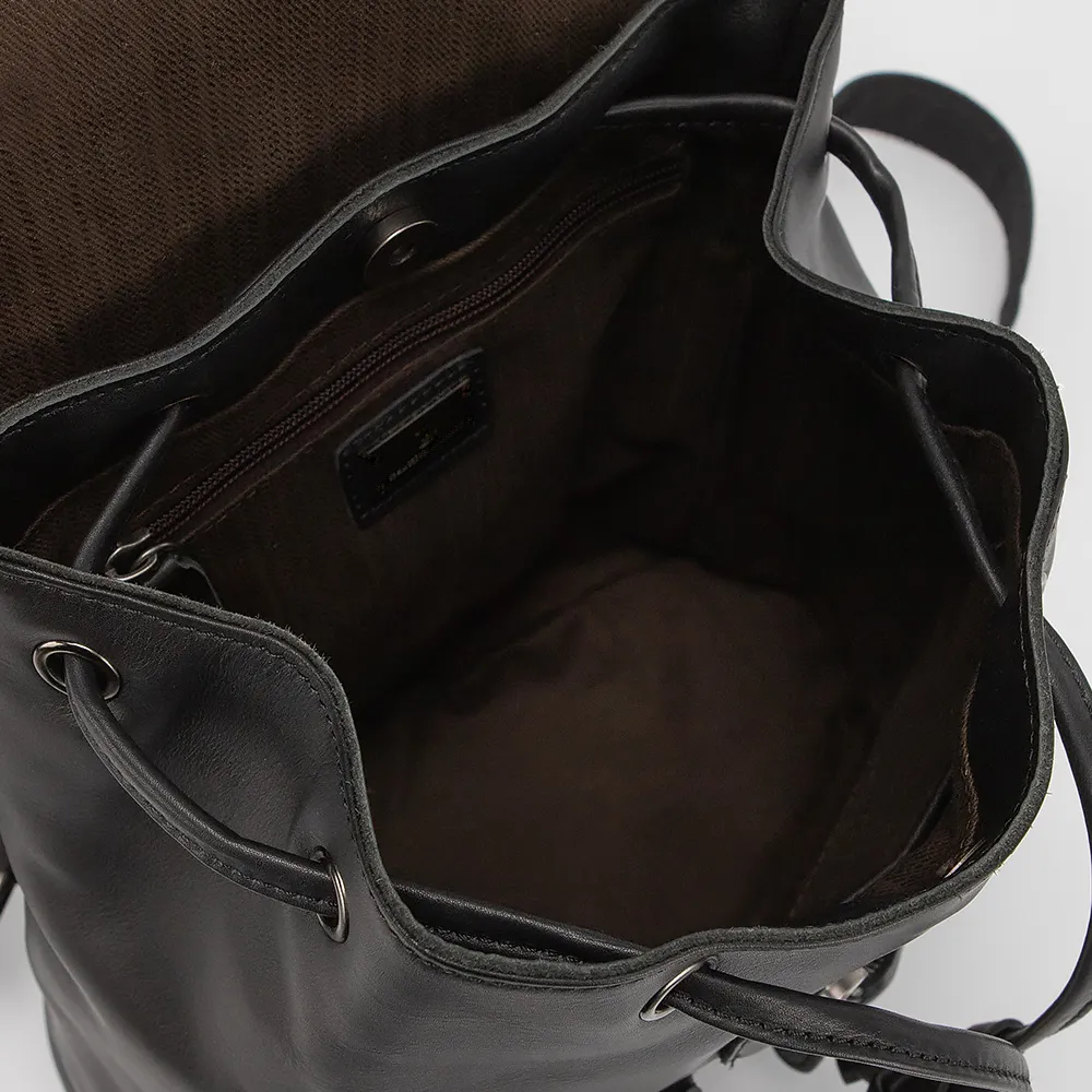 Рюкзак от торговой марки Francesco Molinary выполнен из натуральной кожи черного цвета. Модель с ручкой для переноски и двумя регулируемыми плечевыми ремнями. Клапан на магнитной кнопке закрывает отделение с текстильной подкладкой, карманом на молнии, накладным карманом. Стягивается шнуром по принципу торбы. На лицевой стороне - два объемных кармана на молнии. На задней стороне - вертикальный карман на молнии.