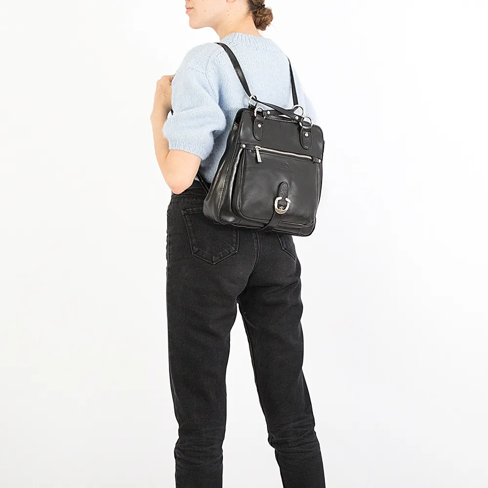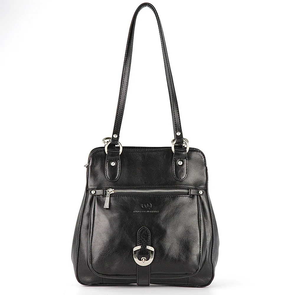 Сумка-рюкзак от торговой марки Francesco Molinary из натуральной кожи черного цвета. Модель с двумя удлиненными ручками, которые при стягивании превращаются в плечевые лямки. Отделение на молнии. Внутри: фирменная подкладка, средник и карман на молнии, два накладных кармана. На лицевой стороне – накладной карман на молнии с декоративным ремешком с пряжкой. На задней стороне – карман на молнии.
