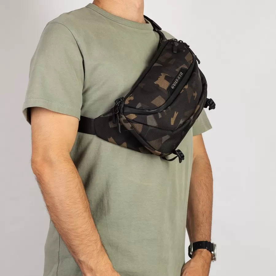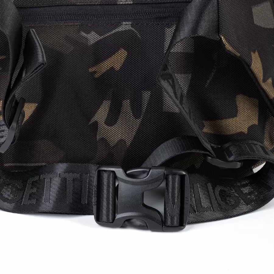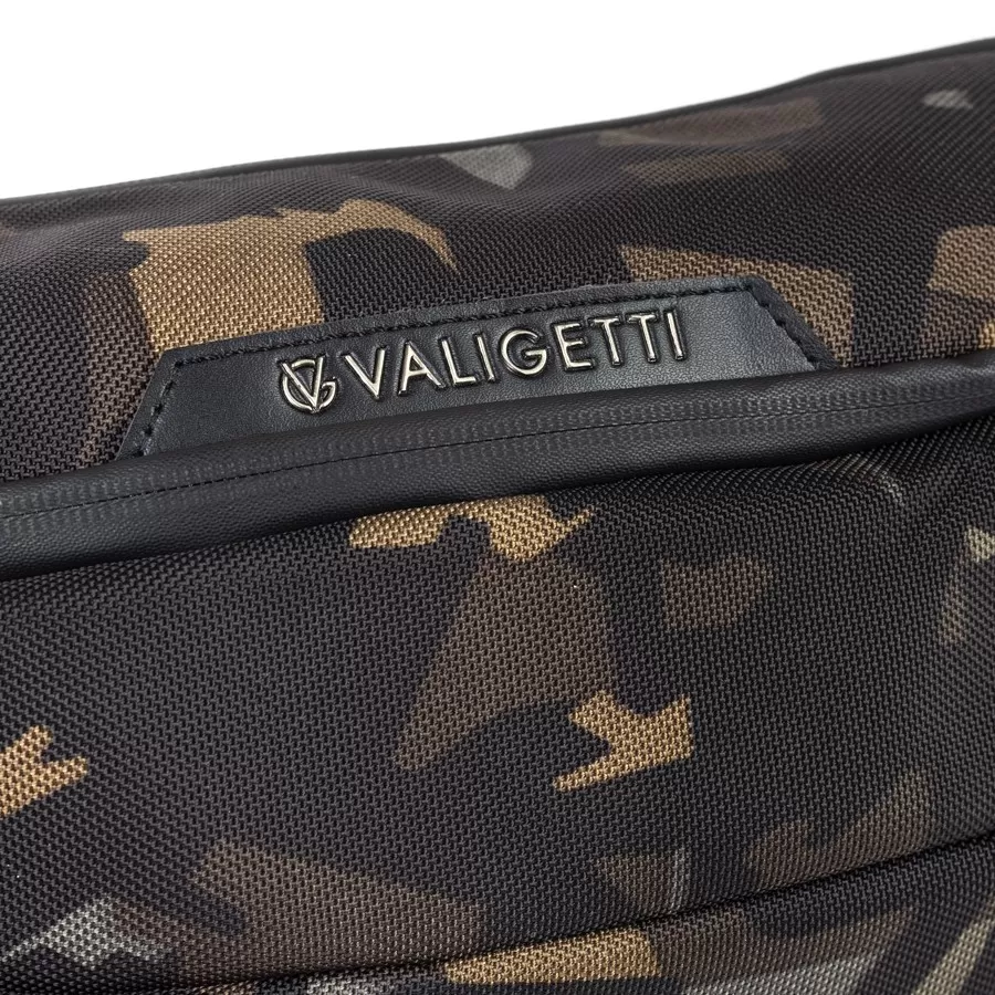 Мужская поясная сумка бренда Valigetti из текстиля в милитари стиле. Имеет вшитую регулируемую текстильную лямку. Прошита фирменной подкладочной тканью. Внутри основного отделения с подрезиненной молнией с двумя замочками есть разделение на 2 отсека и 4 сетчатых кармашка для мелких вещей. На лицевой стороне есть дополнительное отделение на подрезиненной молнии с двумя замочками с внутренним карманом на молнии. Сзади имеется карман на молнии. Снизу есть регуляторы объема сумки