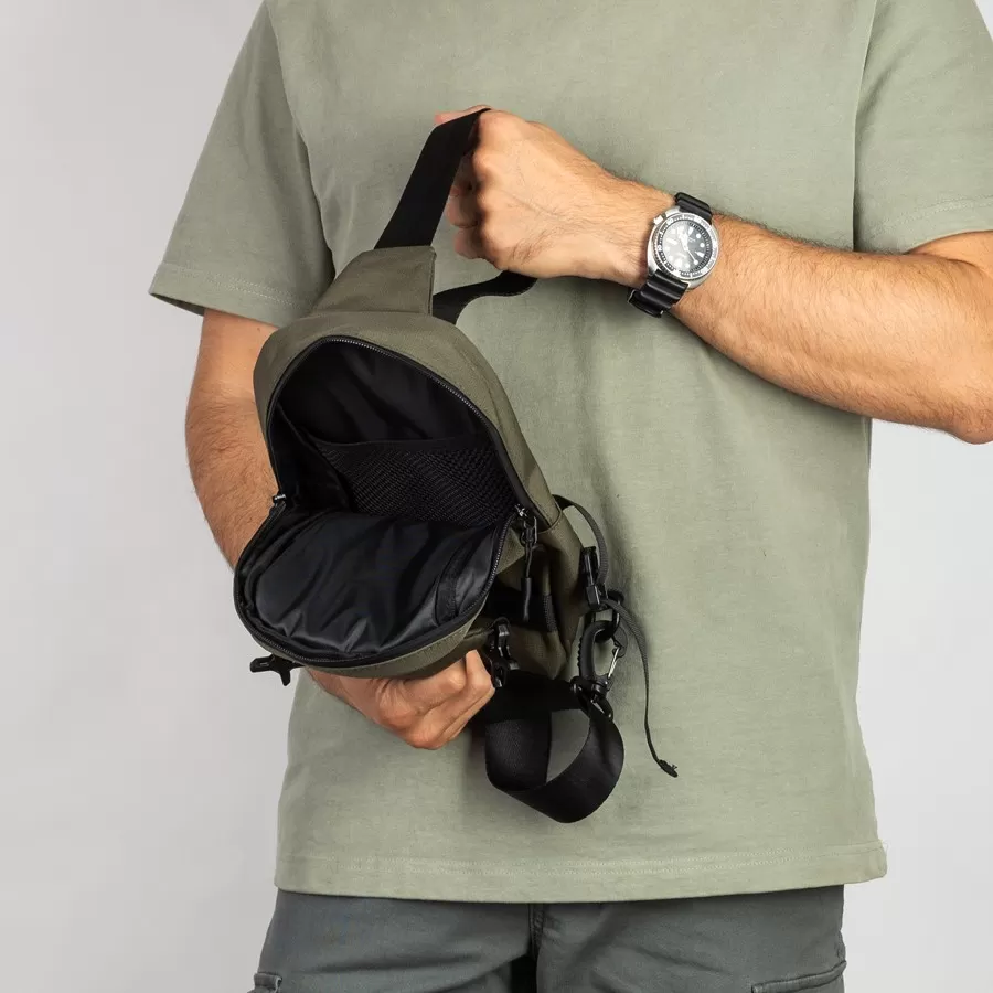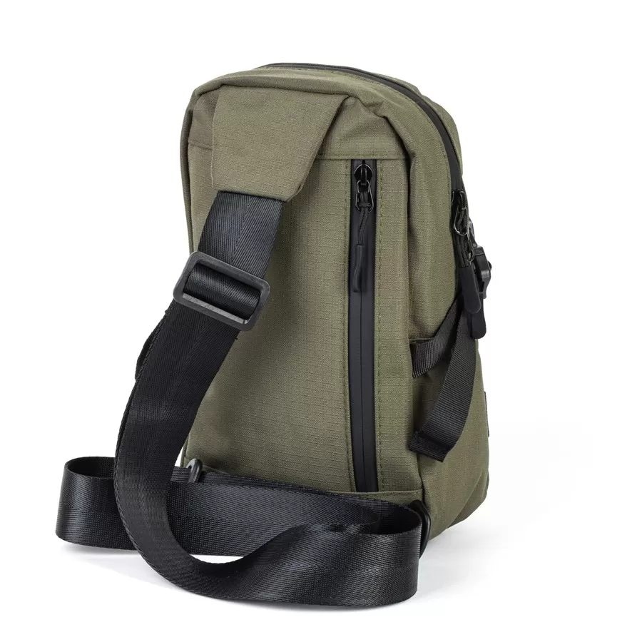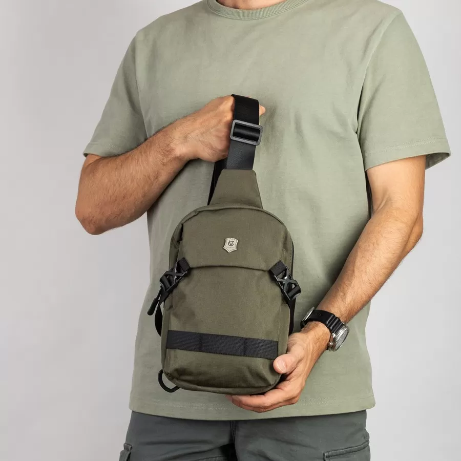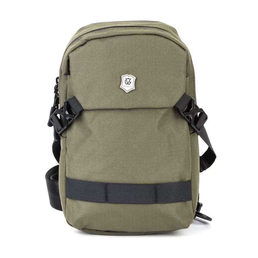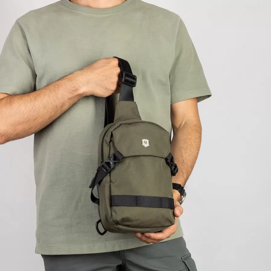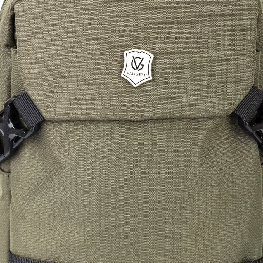 Мужской однолямочный рюкзак бренда Valigetti из текстиля оливкового цвета. Имеет вшитую регулируемую плечевую текстильную лямку. Внутри основного отделения на подрезиненной молнии есть также сетчатый карман. На лицевой стороне есть кармана, защищенный клапаном на затягивающихся замках. На задней стороне есть карман на подрезиненной молнии