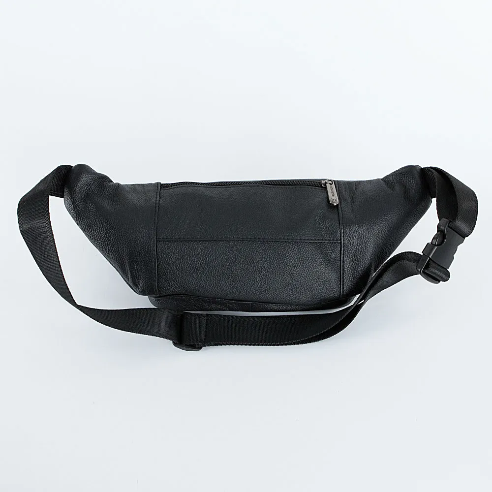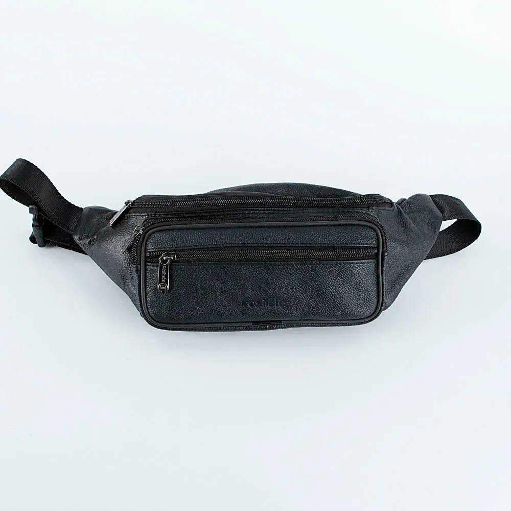 Мужская сумка на пояс от бренда Poshete выполнена из натуральной кожи чёрного цвета. Основное отделение на молнии с текстильной подкладкой, снаружи два кармана на молнии. Модель имеет регулируемый поясной ремень на застежке фастекс.