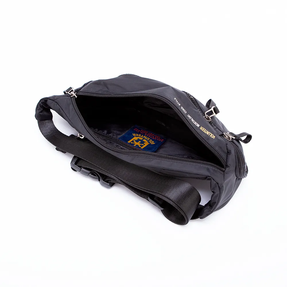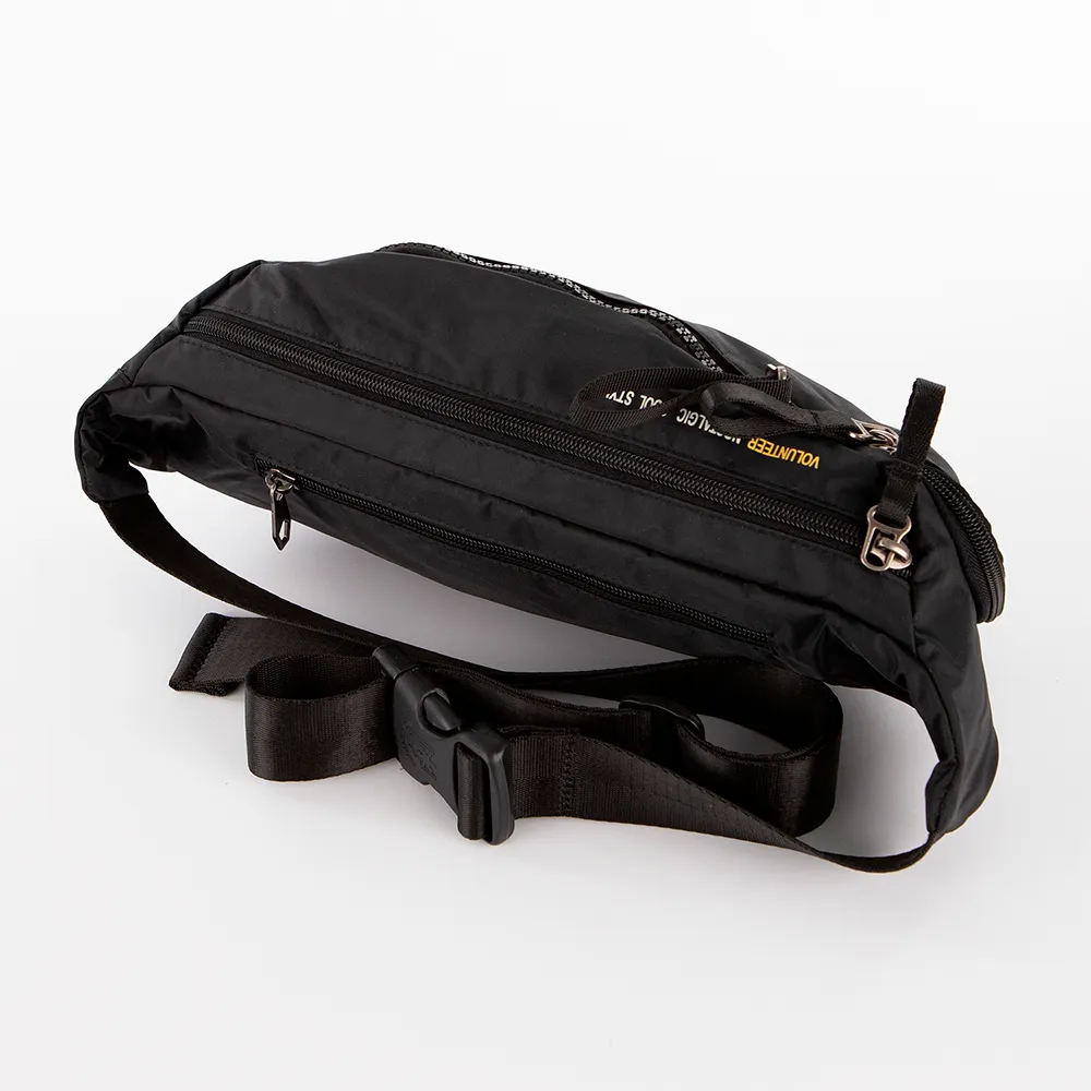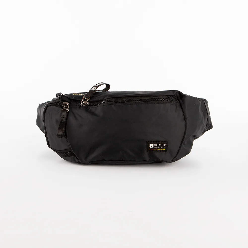 Сумка на пояс от торговой марки Volunteer из практичного прочного текстильного материала черного цвета. Вместительная модель с регулируемым ремнем с застежкой фастекс. Отделение на молнии. Внутри: текстильная подкладка, карман на молнии. На лицевой стороне – два кармана на молнии. На задней стороне – карман на молнии.