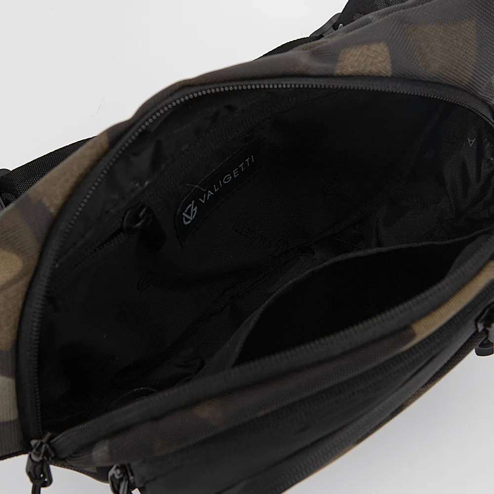 Сумка на пояс от торговой марки Valigetti из прочной текстильной ткани с принтом «камуфляж». Модель с регулируемым поясным ремнем. Отделение на молнии. Внутри: фирменная подкладка, карман на молнии, накладной карман. На лицевой стороне – два кармана на молнии. На задней стороне – карман на молнии.
