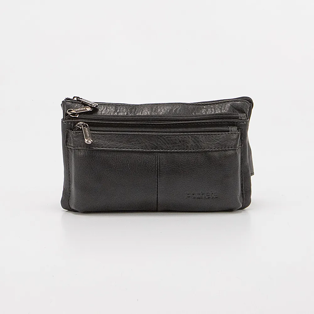 Сумка на пояс от торговой марки Poshete из натуральной кожи черного цвета. Модель с регулируемым поясным ремнем на застежке фастекс. Отделение закрывается молнией. Внутри: текстильная подкладка, перегородка, два отсека, в заднем – карман на молнии. На лицевой стороне – два кармана на молнии.