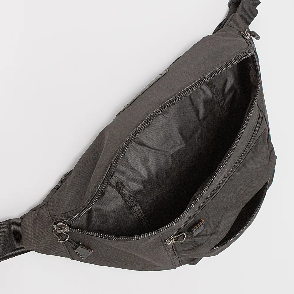 Сумка на пояс от торговой марки Valigetti из текстильного материала черного цвета. Вместительная модель с регулируемым ремнем на застежке фастекс. Отделение на молнии с двумя встречными бегунками. Отделение на молнии. Внутри: текстильная подкладка, карман на молнии. На лицевой стороне – два кармана на молнии. На задней стороне – карман на молнии.