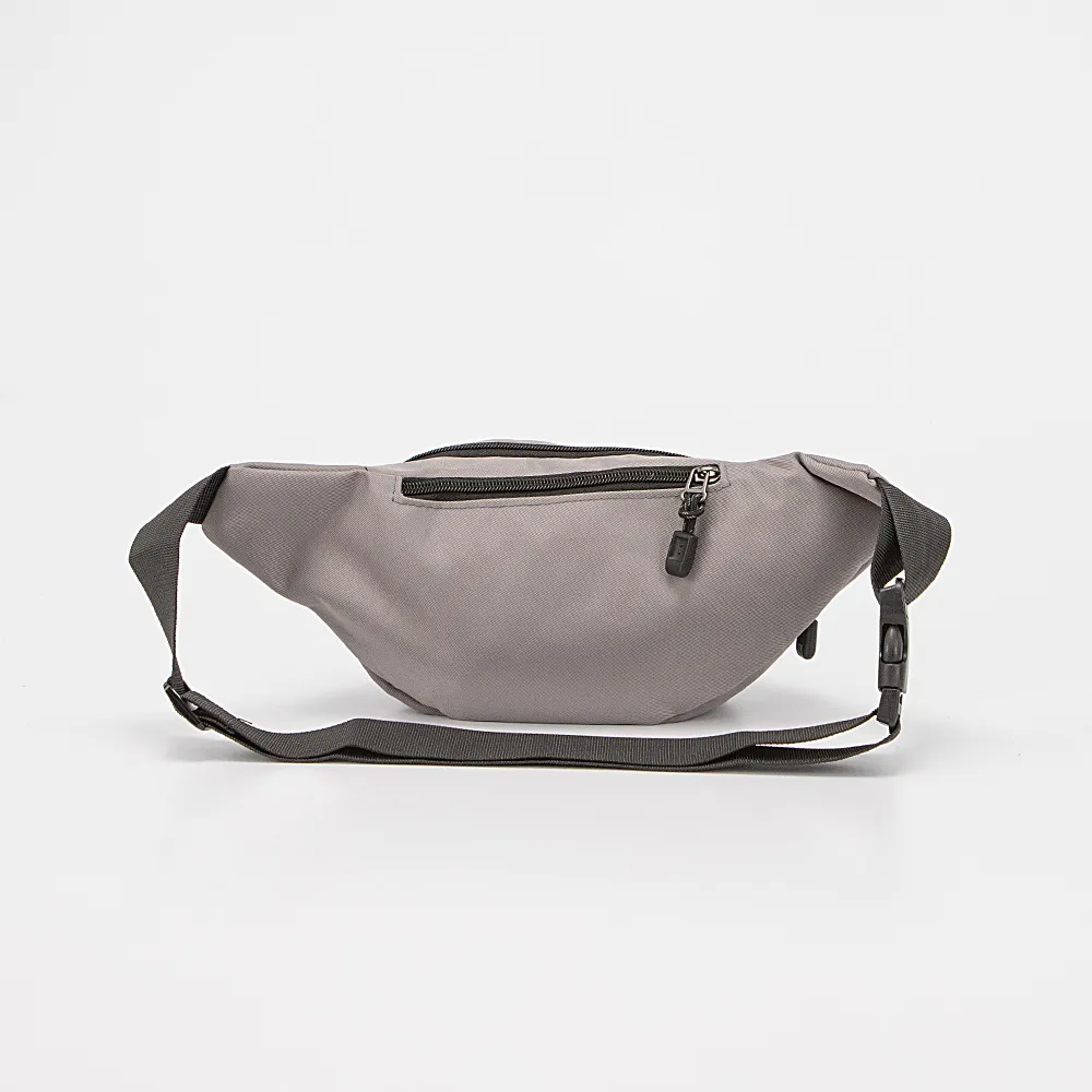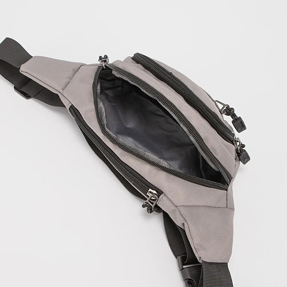 Сумка на пояс от торговой марки Valigetti из текстильного материала серого цвета. Модель с регулируемым ремнем на застежке фастекс. Отделение на молнии, с текстильной подкладкой и накладным карманом. На лицевой стороне – два кармана на молнии. На задней стороне – карман на молнии.