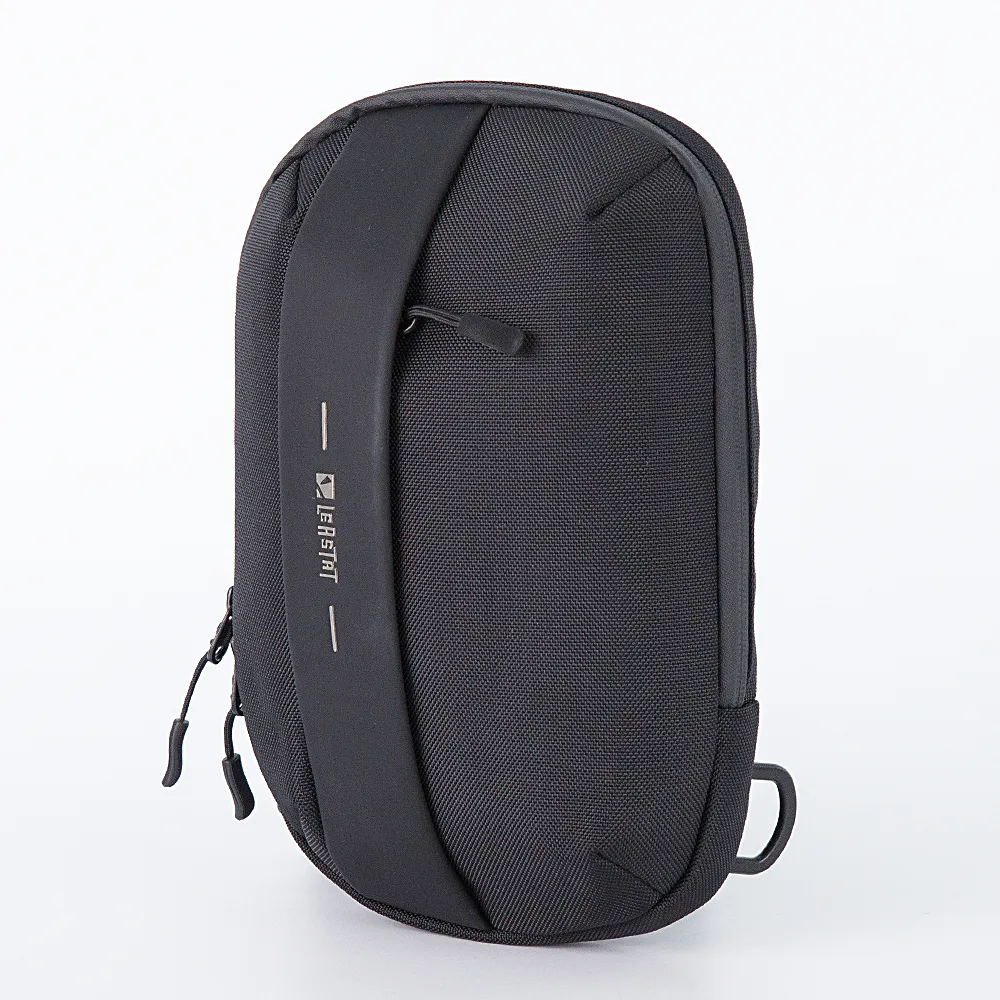 Однолямочный рюкзак от торговой марки Leastat из плотного текстильного материла и искусственной кожи черного цвета. Модель закруглен ной формы с регулируемой плечевой лямкой, которую можно носить как на правом, так и на левом плече. Отделение на молнии с двумя встречными бегунками. Внутри: фирменная подкладка, карман на молнии, накладной карман, органайзер для канцелярских принадлежностей, крепления для ключей. Мягкая спинка с верхним дышащим слоем; имеется карман на молнии. На лицевой стороне – скрытый вертикальный карман на молнии.