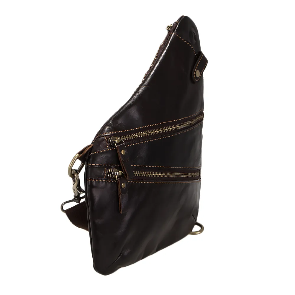 Стильная сумка-кобура от бренда Poshete выполнена из натуральной кожи коричневого цвета. Модель со съемным плечевым ремнем, выполнен ным из текстильного материала. Отделение на молнии, с текстильной подкладкой. На передней стороне имеется три кармана, два из которых на молнии, верхний – на кнопке. На задней стороне – карман на вертикальной молнии. Спереди декорирована фирменным тиснением.