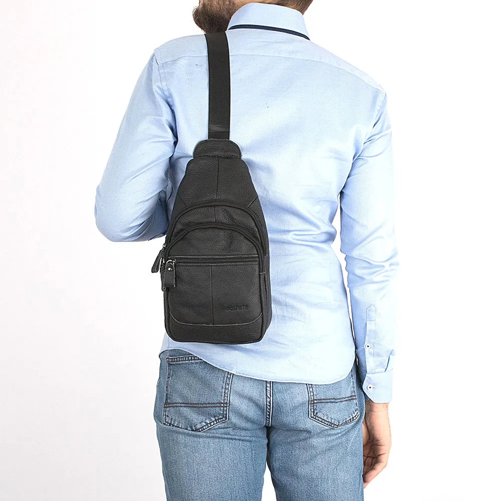 Повседневный мужской рюкзак от бренда Poshete чёрного цвета, с отличным качеством отделки, выполнен из натуральной кожи в сочетании с металлической фурнитурой. Авто документы, ключи и бумажник всегда будут под рукой. Рюкзак компактного размера, отлично подходит путешественникам, носится на регулируемой атласной лямке через плечо. Снаружи три кармана, один сзади без застёжки и два спереди на молниях. Основное отделение на молнии, внутри текстильная подкладка и запасной кармашек. Сбоку имеется металлический люверс, через который можно продеть наушники.