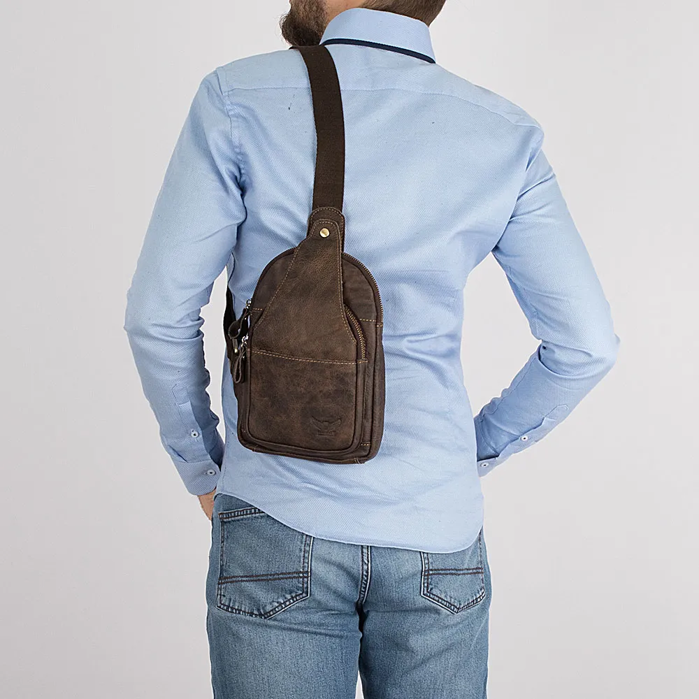 Однолямочный от торговой марки Poshete из натуральной кожи коричневого цвета. Модель с широкой регулируемой плечевой лямкой, выполненной из текстильного материала. Клапан на магнитной кнопке закрывает карман без застежки, карман на молнии и отделение на молнии с фирменной подкладкой. На лицевой стороне – накладной карман.